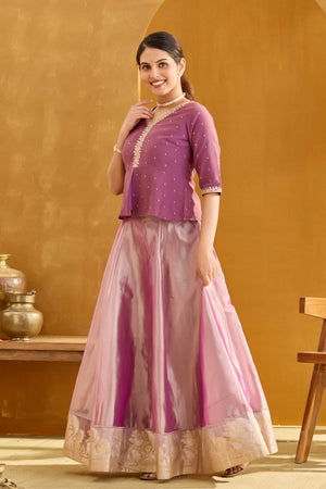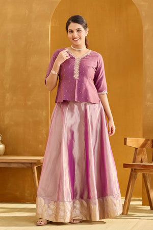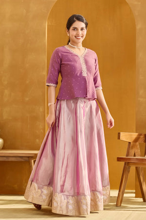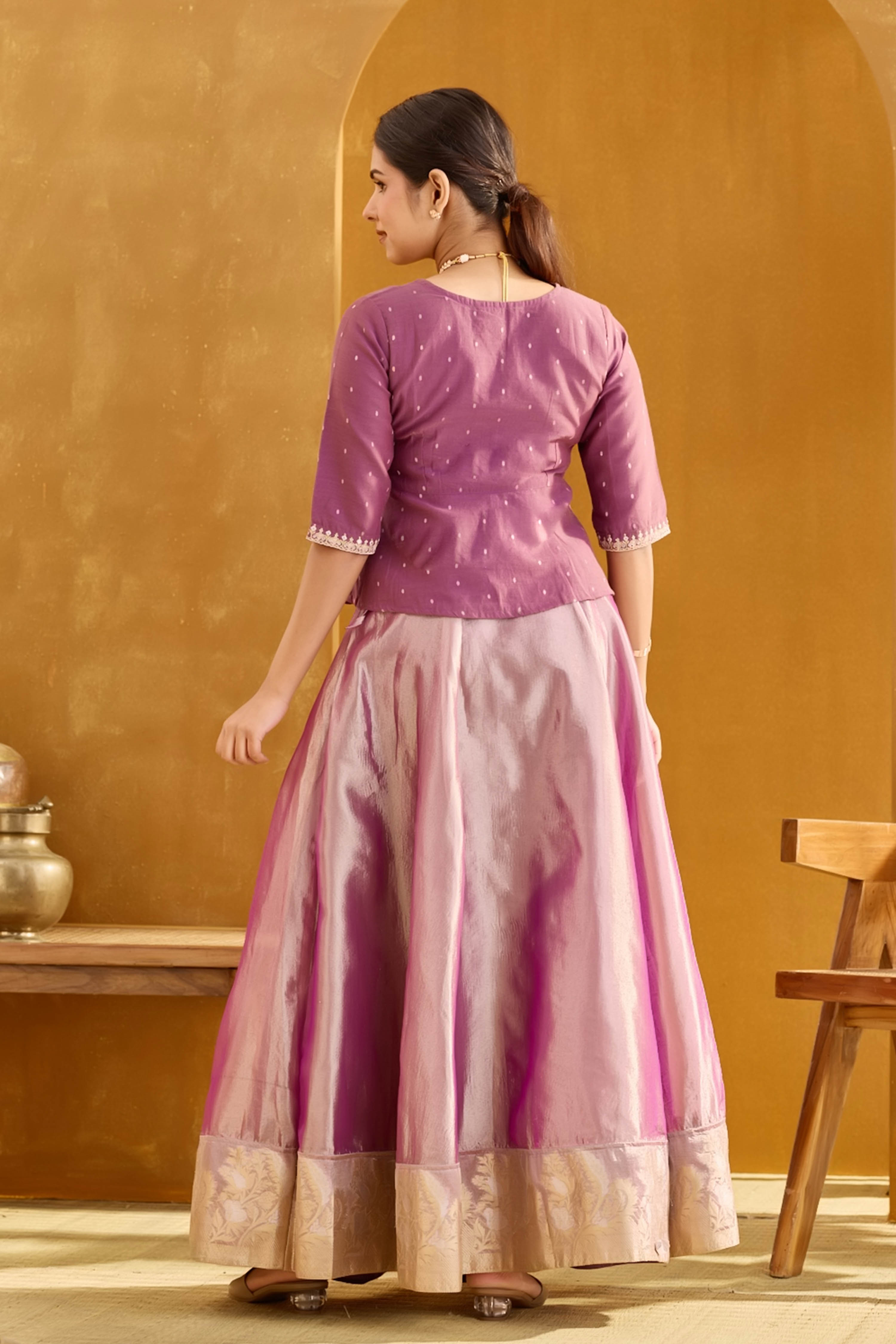 Celebrate in style with this mauve and rose gold skirt set, featuring a flared jacquard crop top with golden embroidery and foil mirror work. Paired with a shimmery circular tissue skirt and cotton lining, it’s perfect for Diwali festivities.