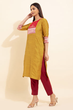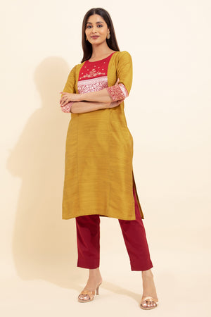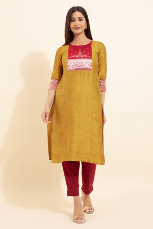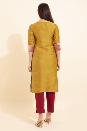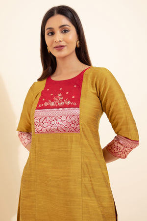 Floral Embroidered Kurta with Zari Border - Mustard