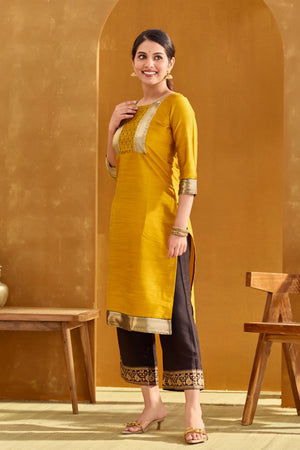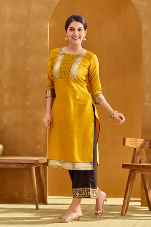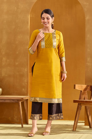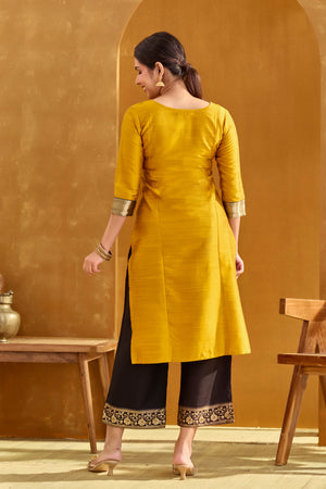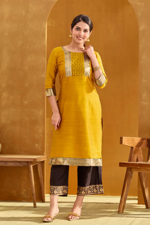 Enhance your festive look with this Mustard straight-line kurta adorned with golden embroidery and foil mirror work. Crafted in silky slub fabric with a round neck and 3/4th sleeves, it’s perfect for Diwali celebrations and traditional occasions.