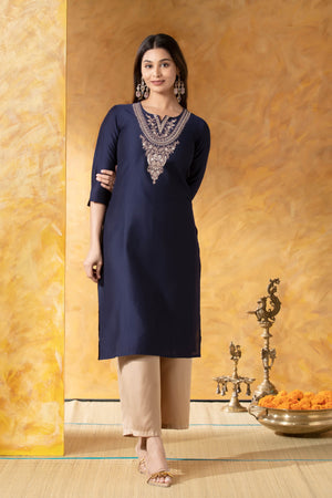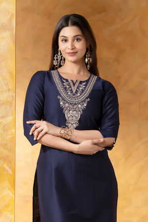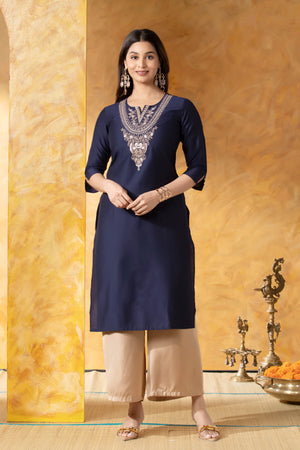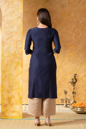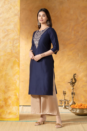 Elevate your festive look with this navy blue kurta featuring intricate embroidery and sequin work. Straight-line fit offers comfort and style, perfect for celebrations and special occasions.