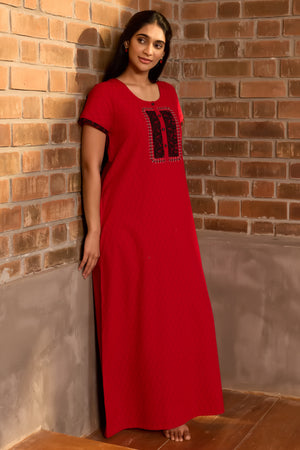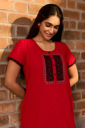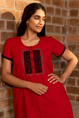 Red cotton nightwear featuring classic butta prints, designed with a scoop neckline and functional button placket. Finished with short sleeves and a breathable regular fit for everyday comfort.