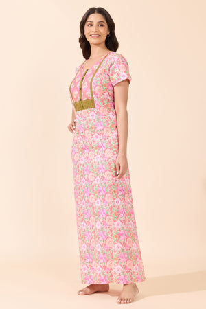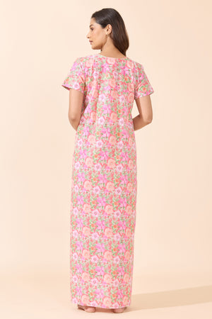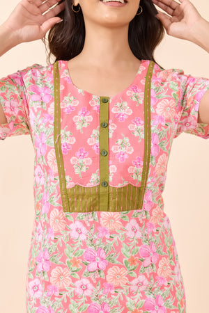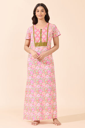 Peach Pastel Floral Cotton Nighty with Patchwork Yoke