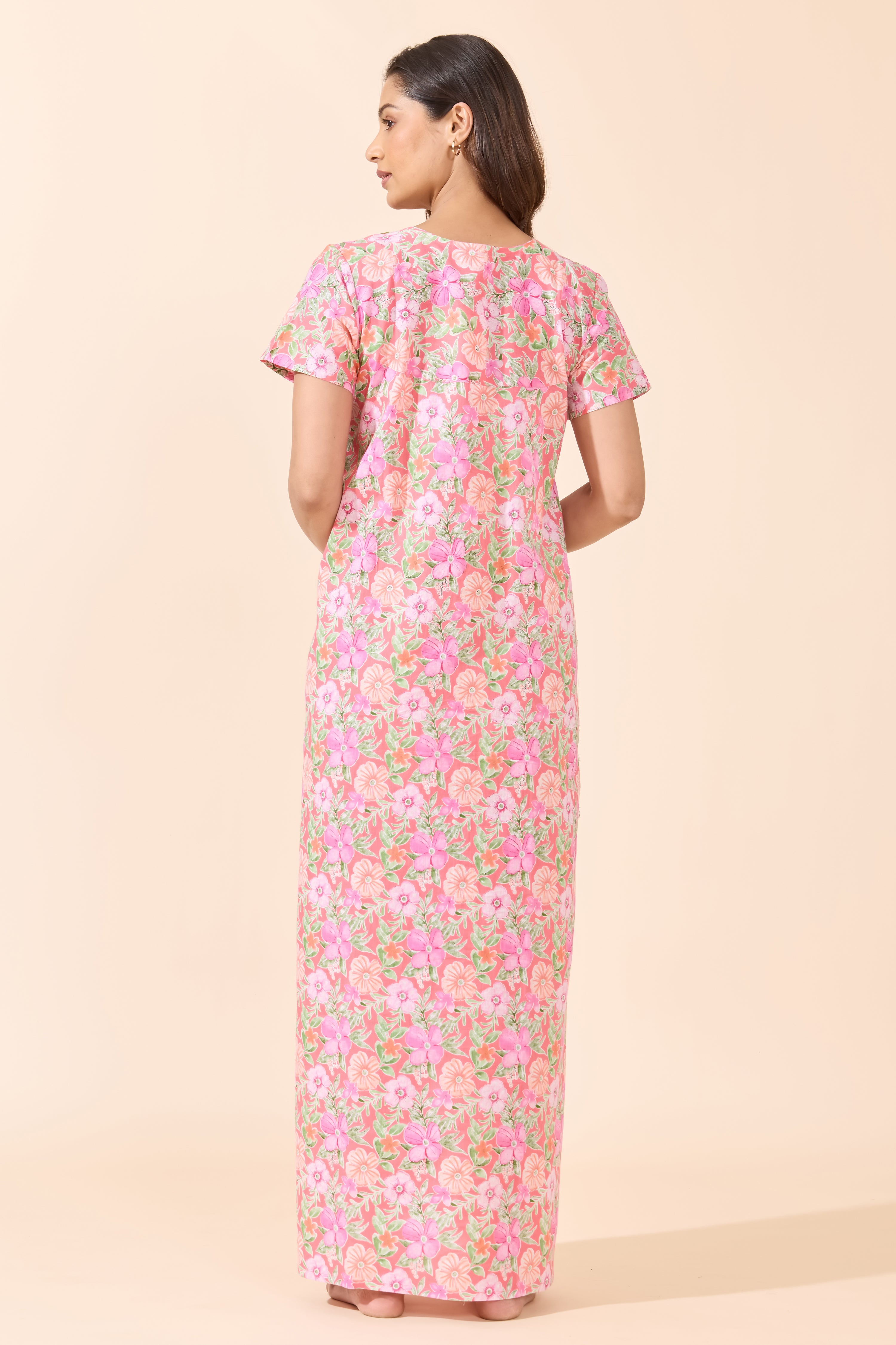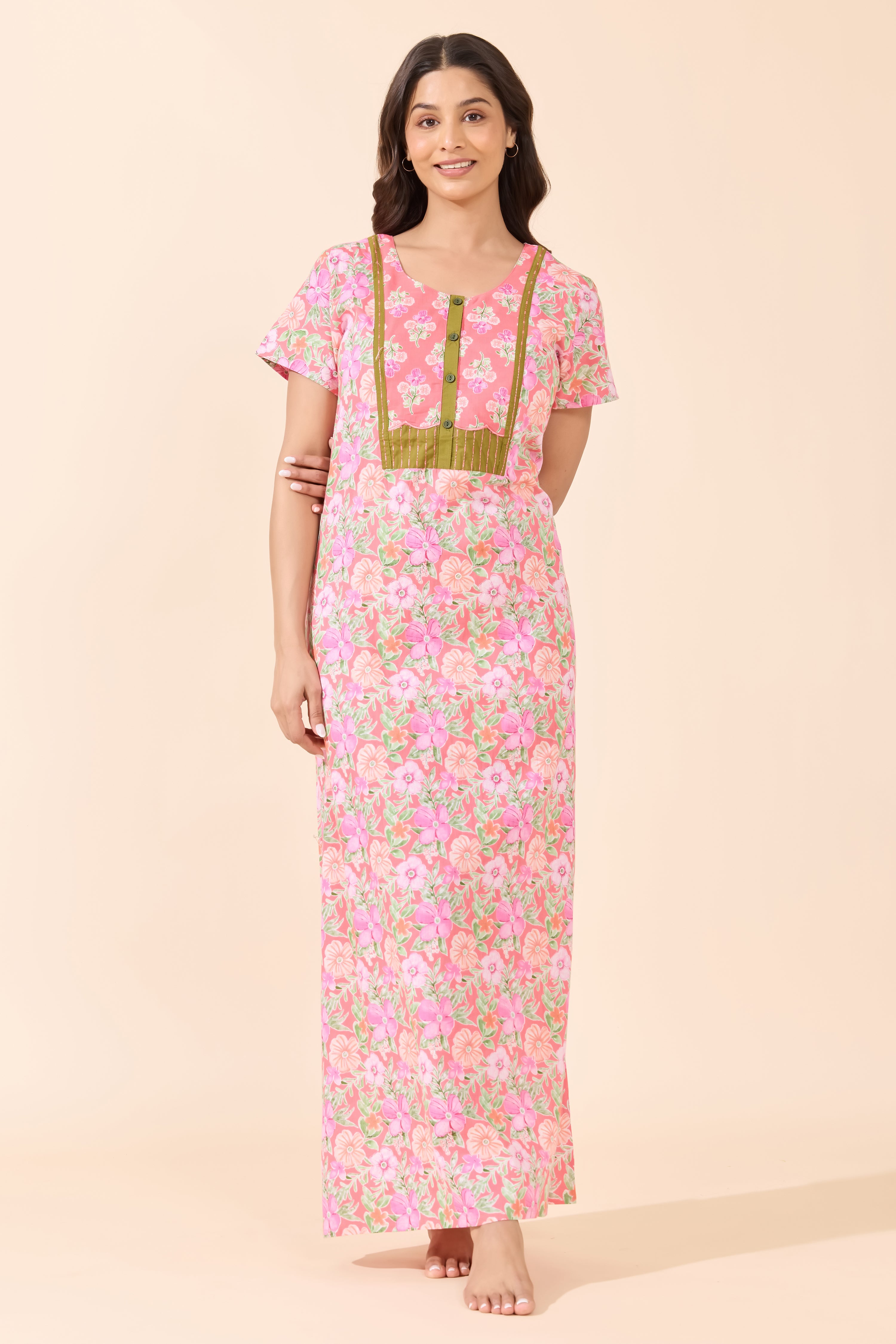 Add a soft touch to your nights with this peach floral cotton nighty featuring a patchwork yoke and front button closure. Gentle on skin, easy to wear, and perfect for all-day lounging comfort.
