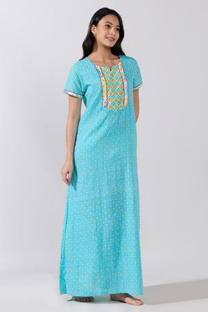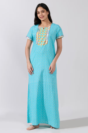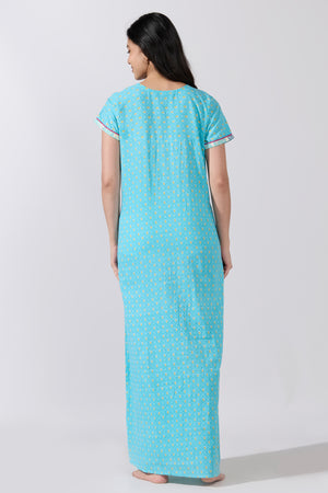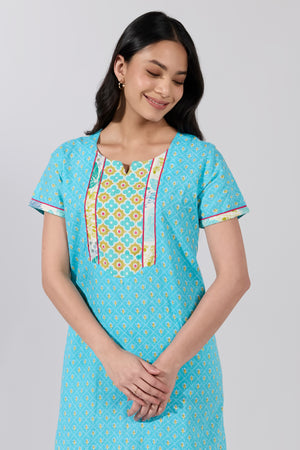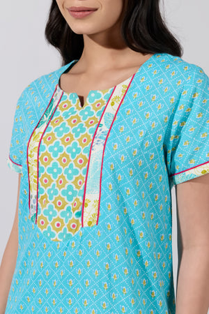 Light blue cotton nightwear featuring soft lotus prints paired with a retro geometric floral yoke for a playful contrast. Designed with a round neck with V notch, short sleeves, and a relaxed fit for easy, breathable comfort.