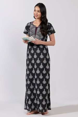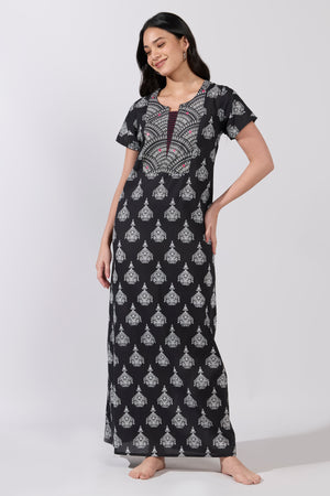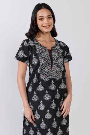 Black Chandelier Print Cotton Nighty with Jaal Yoke