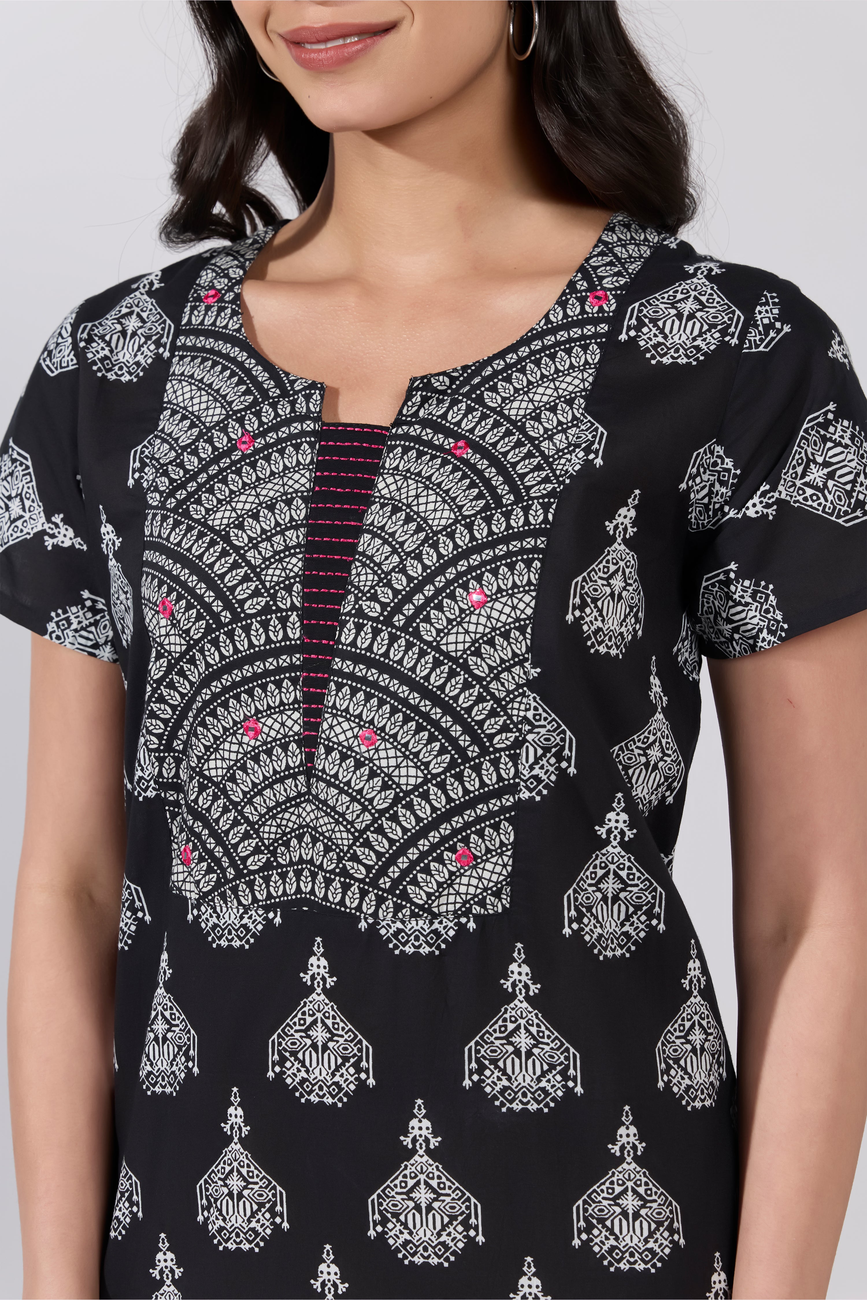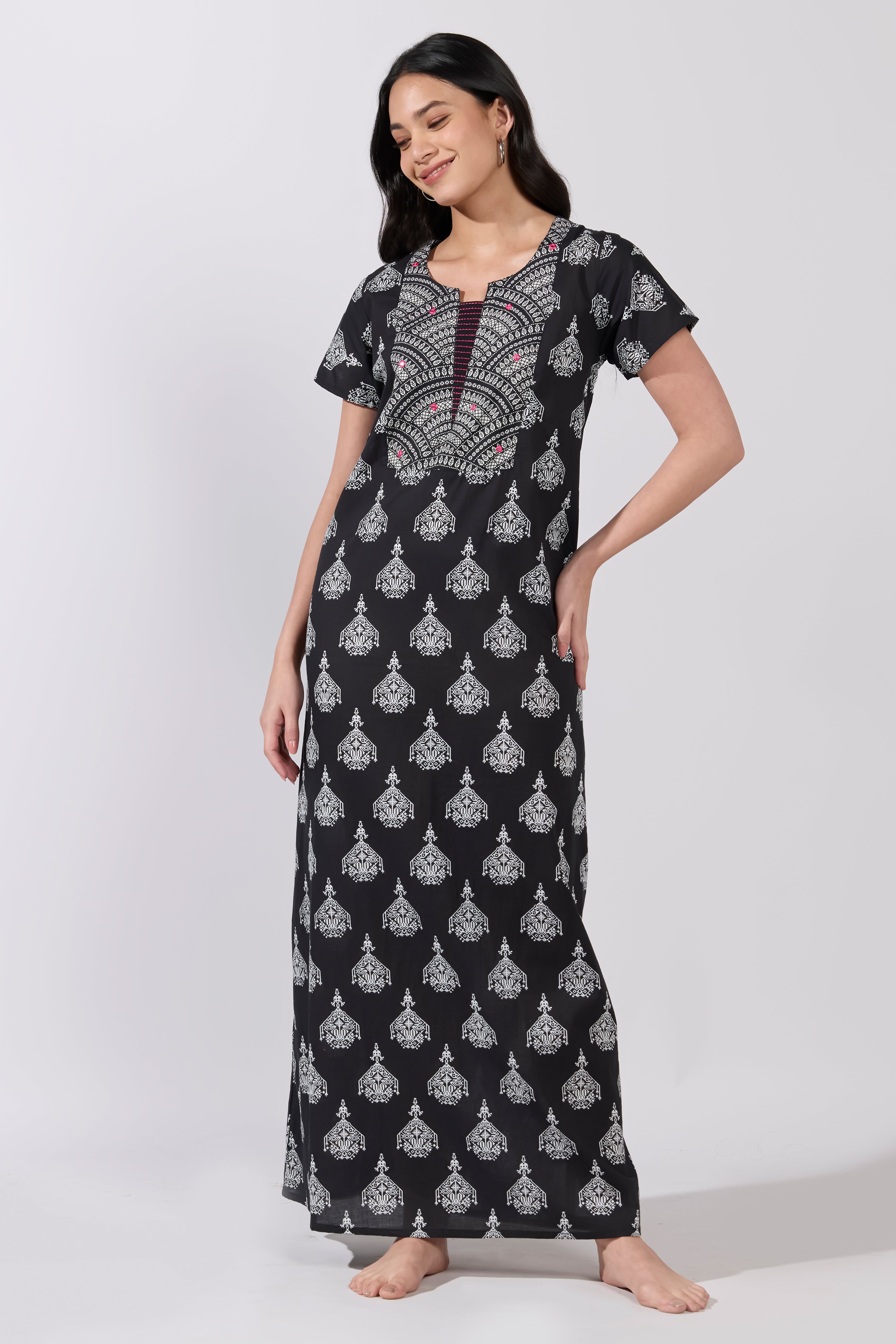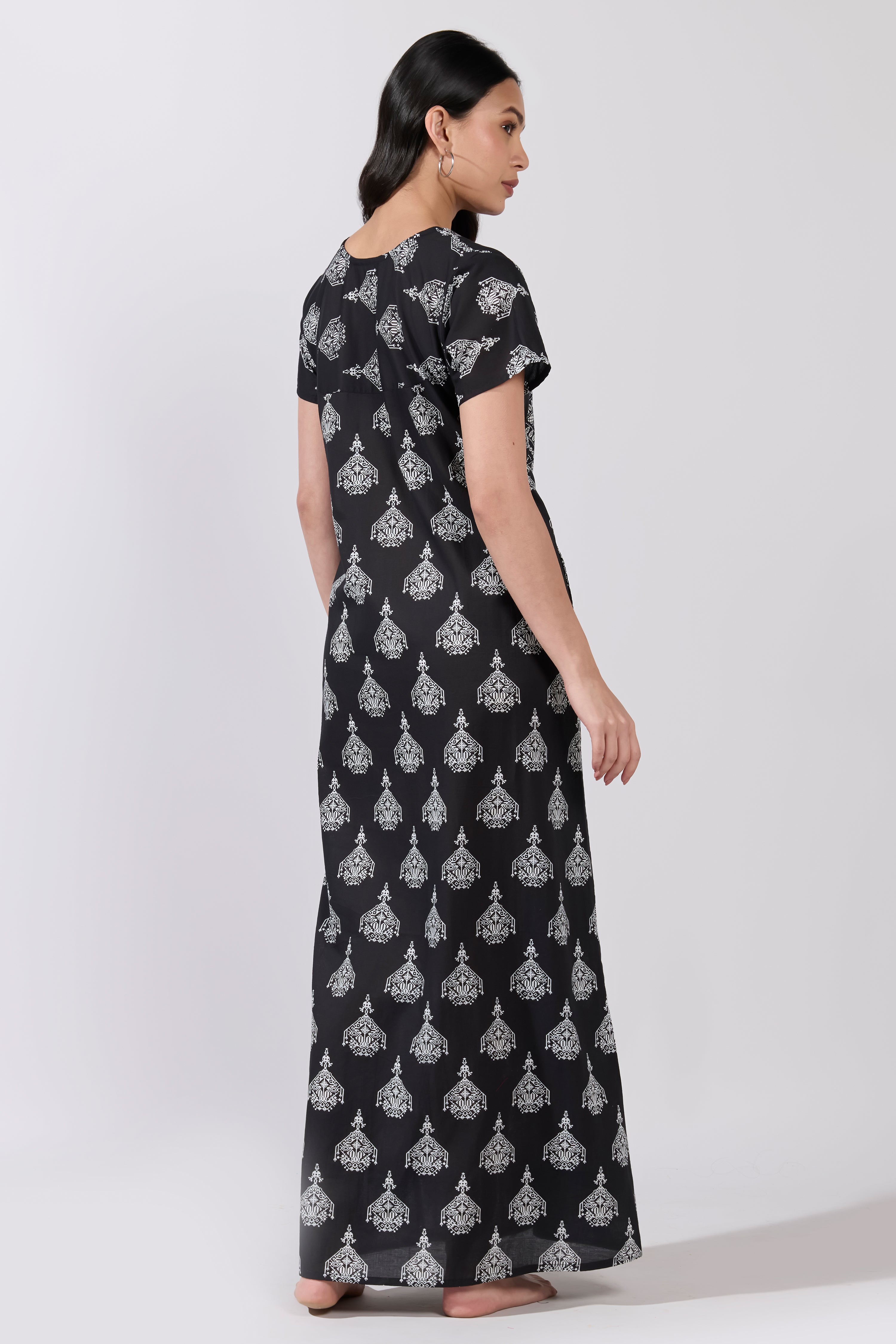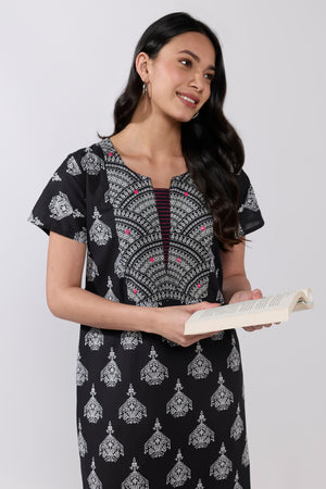 Elevate your nightwear with this black cotton nighty featuring a chandelier print and jaal motif yoke. Soft, breathable fabric with a relaxed fit for stylish everyday comfort.