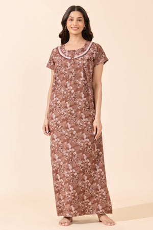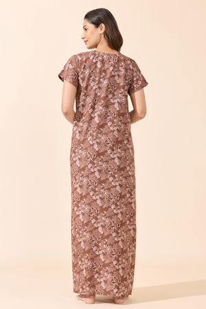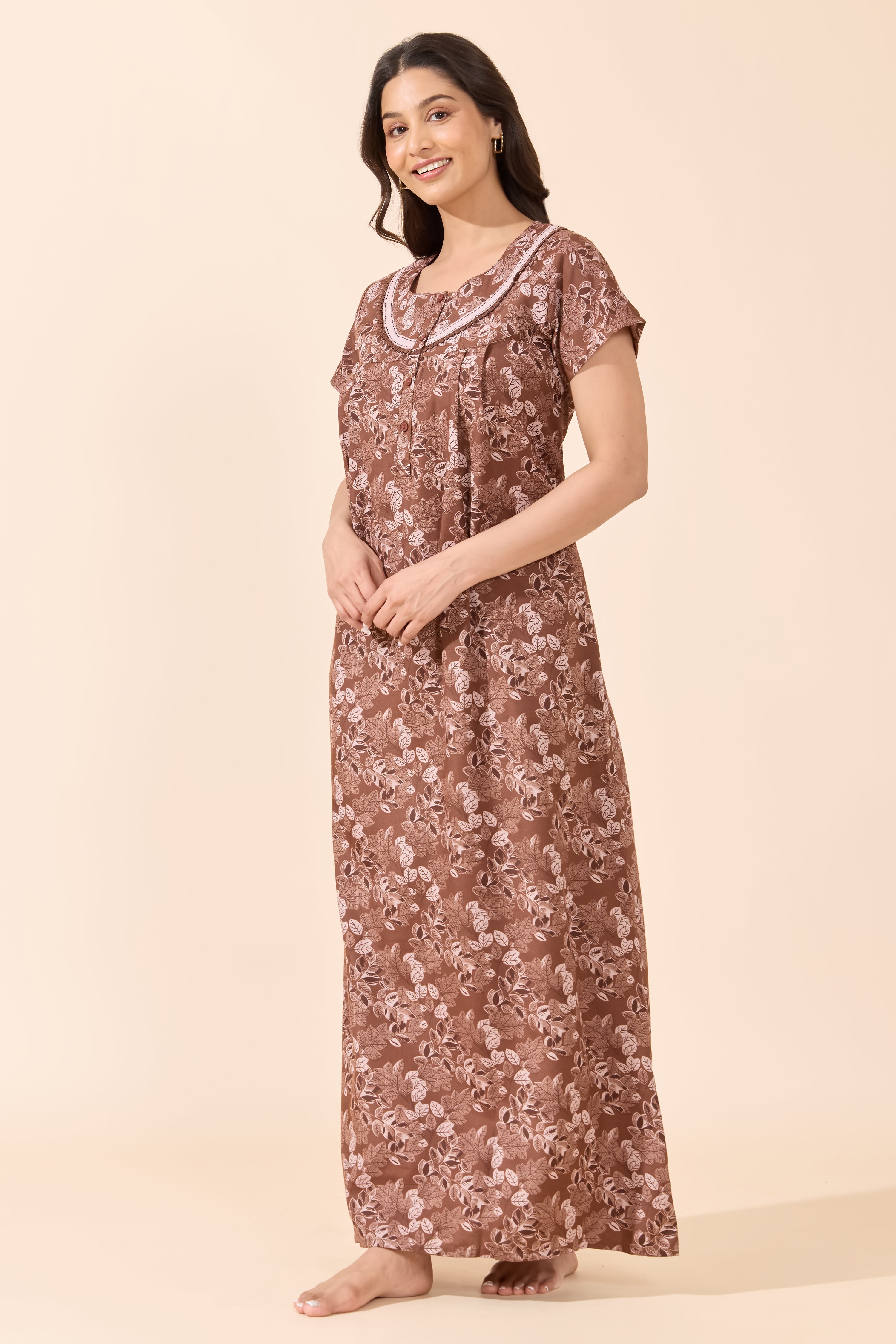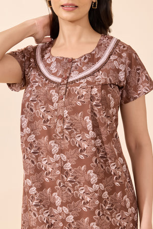 Embrace earthy tones with this brown foliage print cotton nighty detailed with a lace yoke and button front. Soft, breathable fabric and a relaxed fit make it perfect for everyday lounging and sleep.