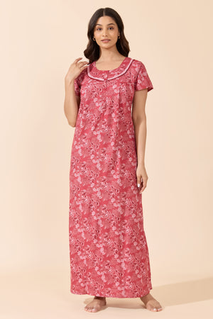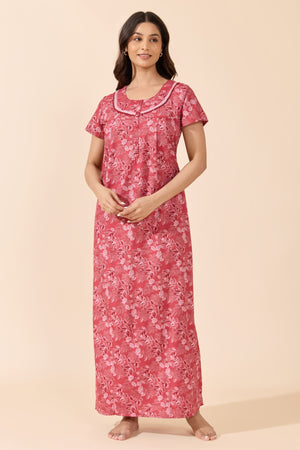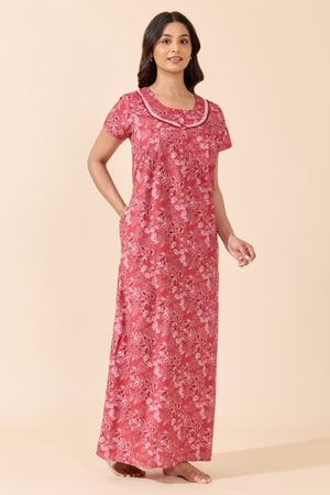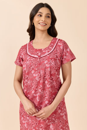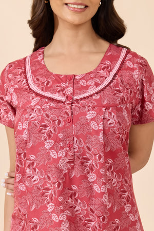 Red Foliage Print Cotton Nighty with Lace