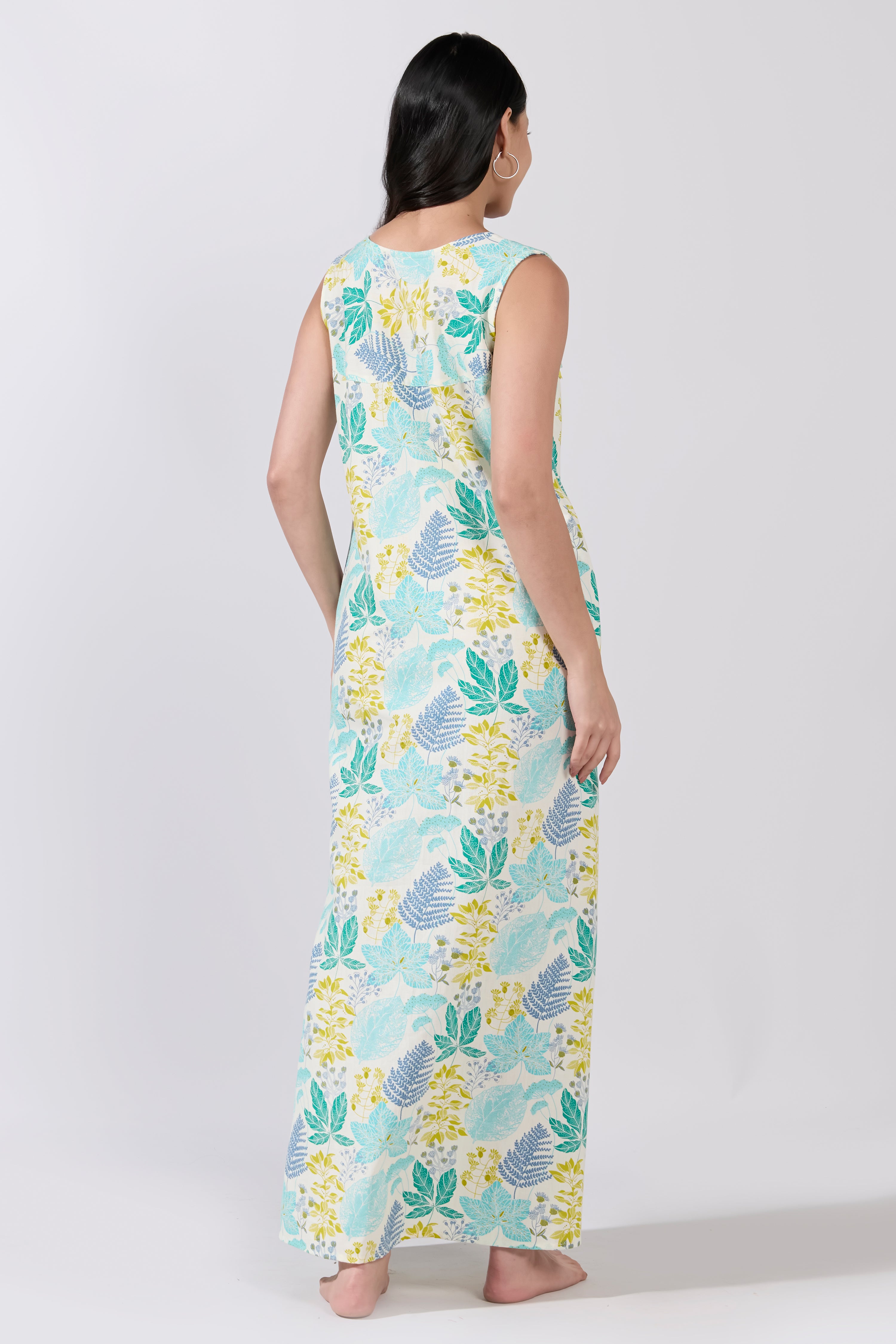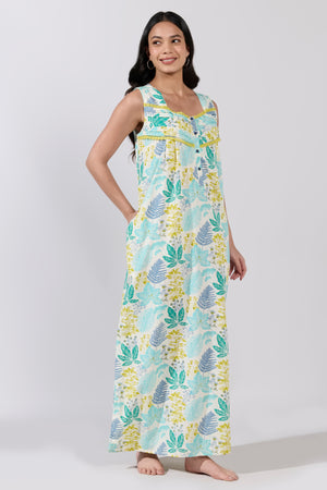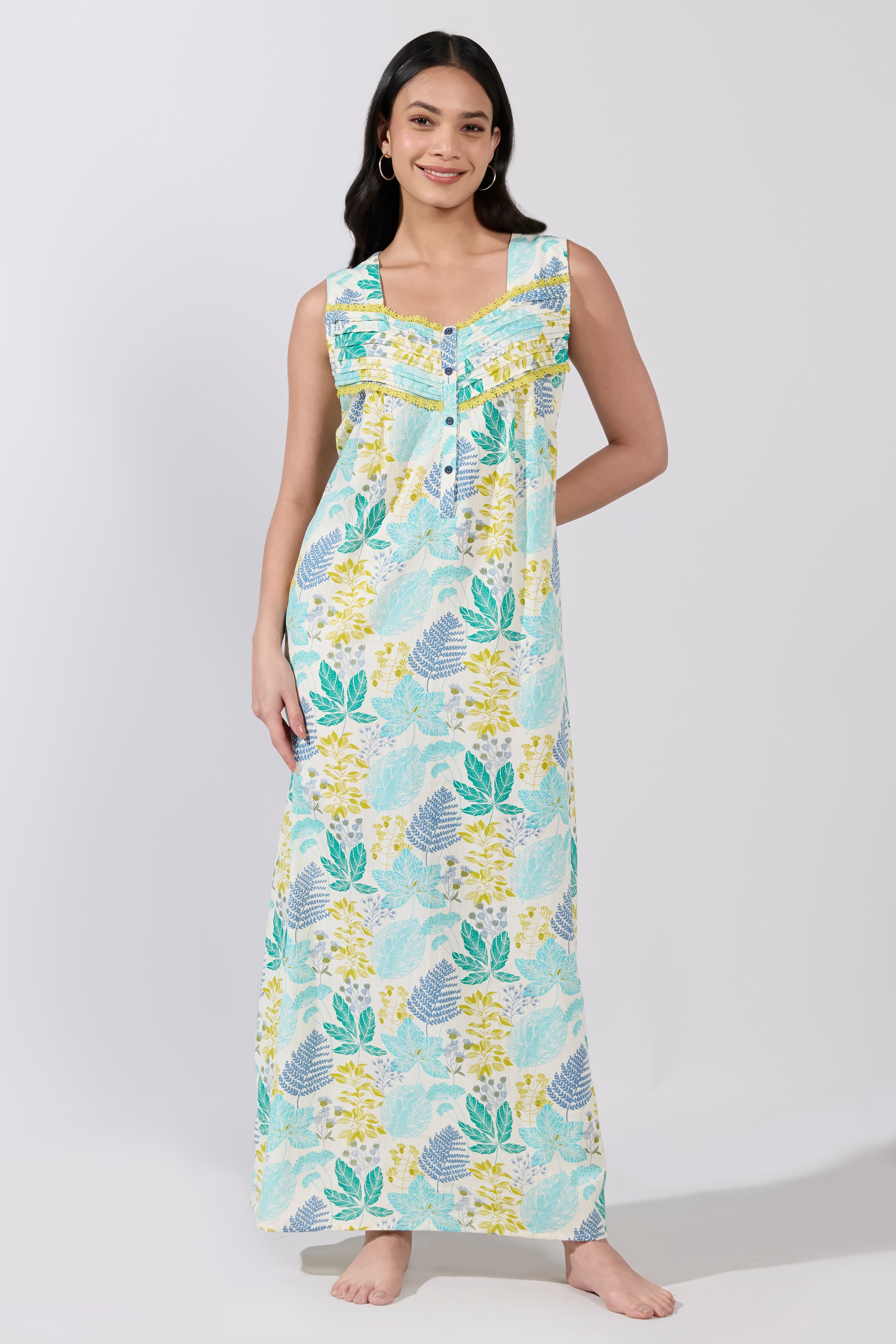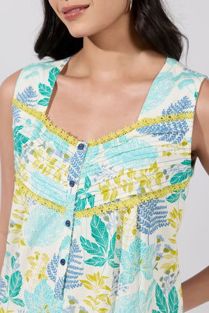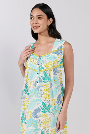 Blue cotton nightwear adorned with fresh tropical leaf prints and a softly pleated yoke for added texture. Featuring a V neckline, sleeveless cut, and functional button closure—crafted for airy, all-day comfort.