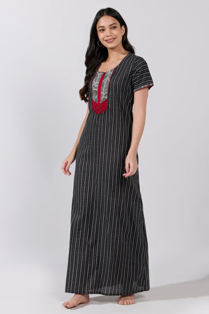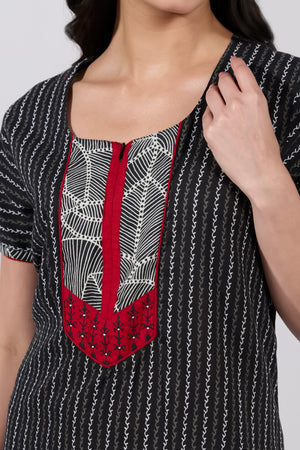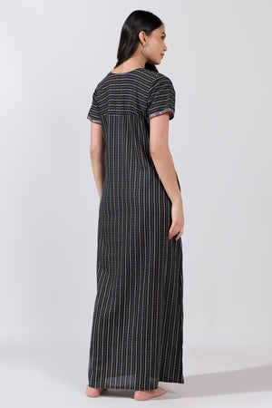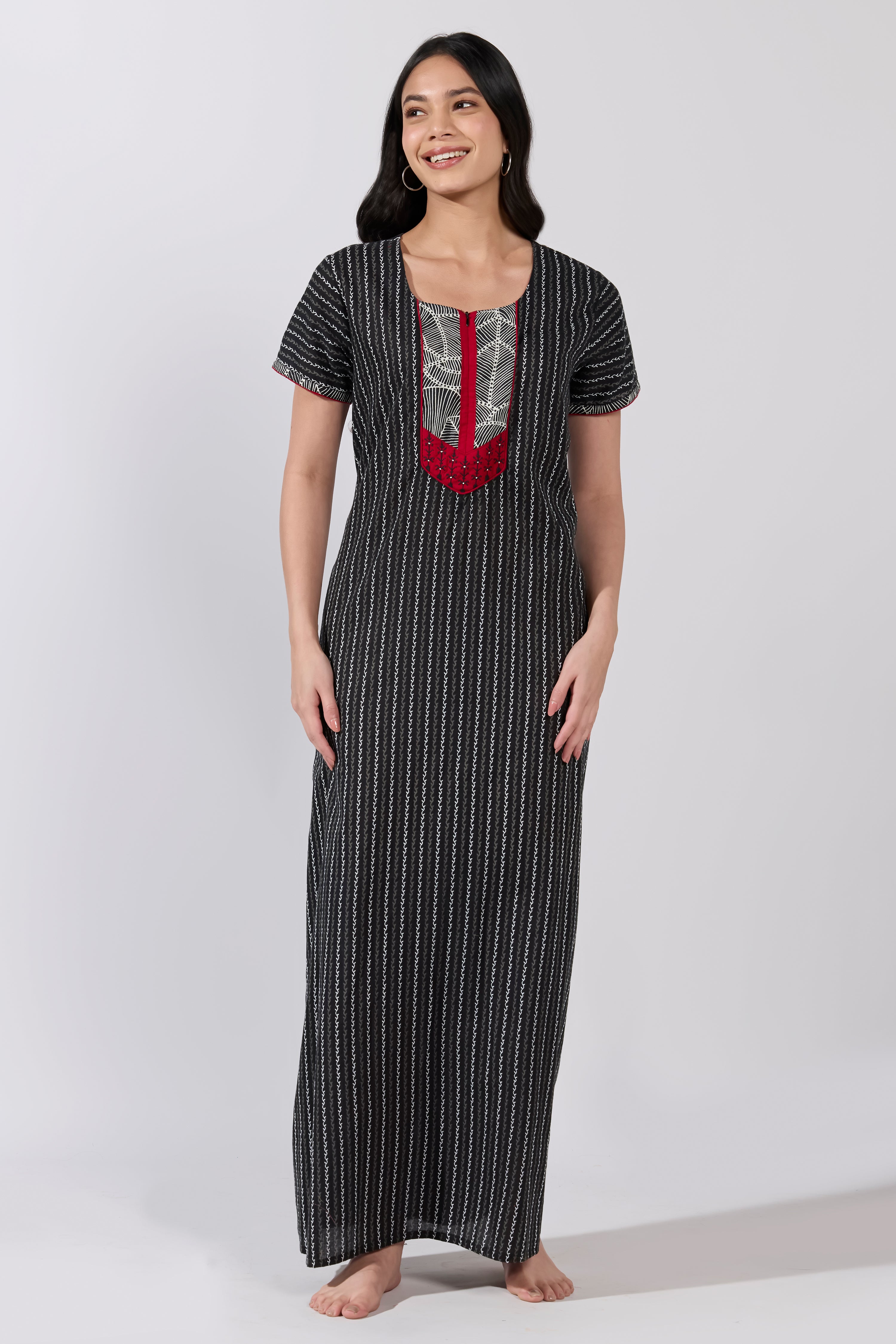 Stay effortlessly stylish in this black striped cotton nighty featuring a printed yoke and functional zip front. Soft, breathable fabric with a relaxed fit for easy everyday comfort.
