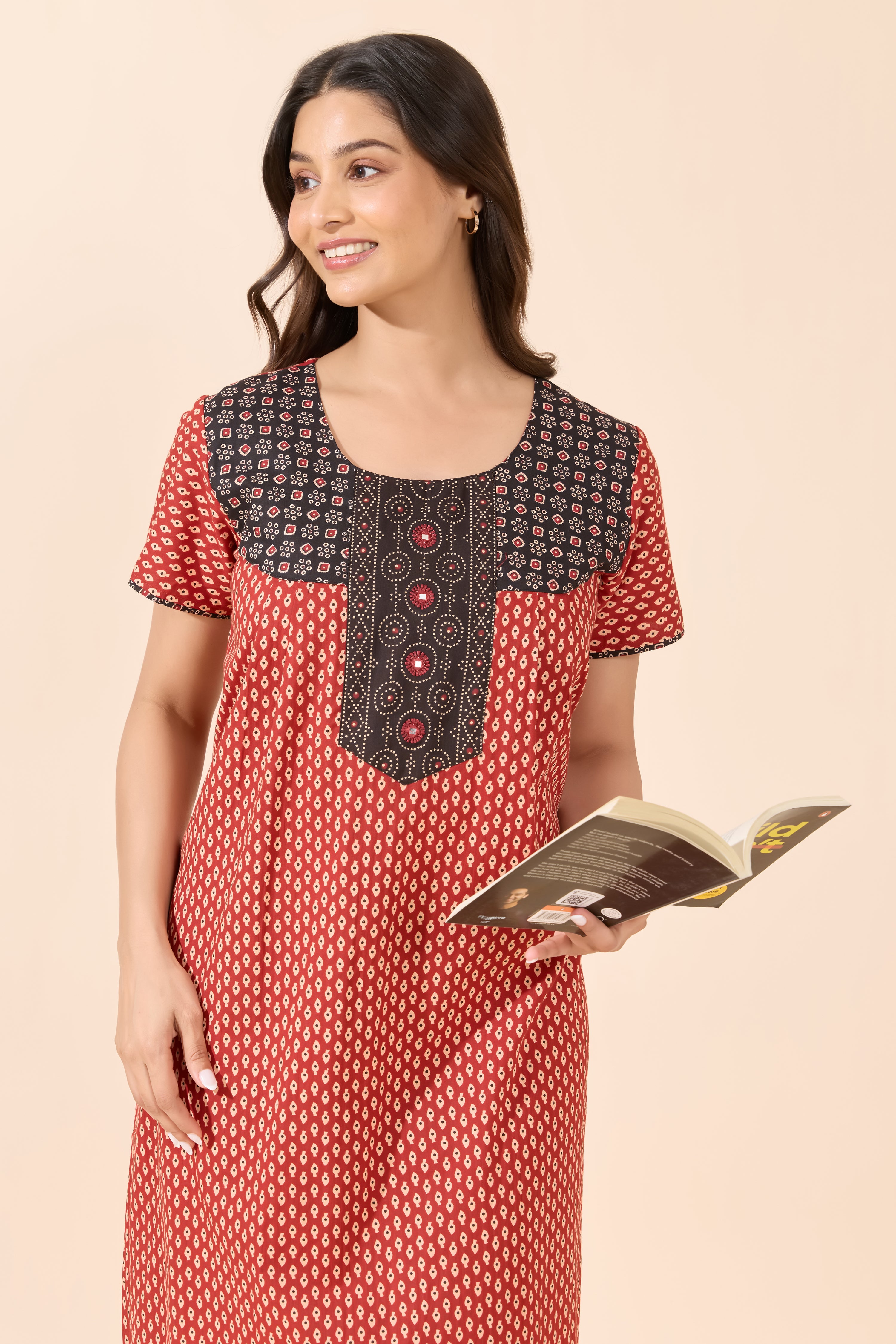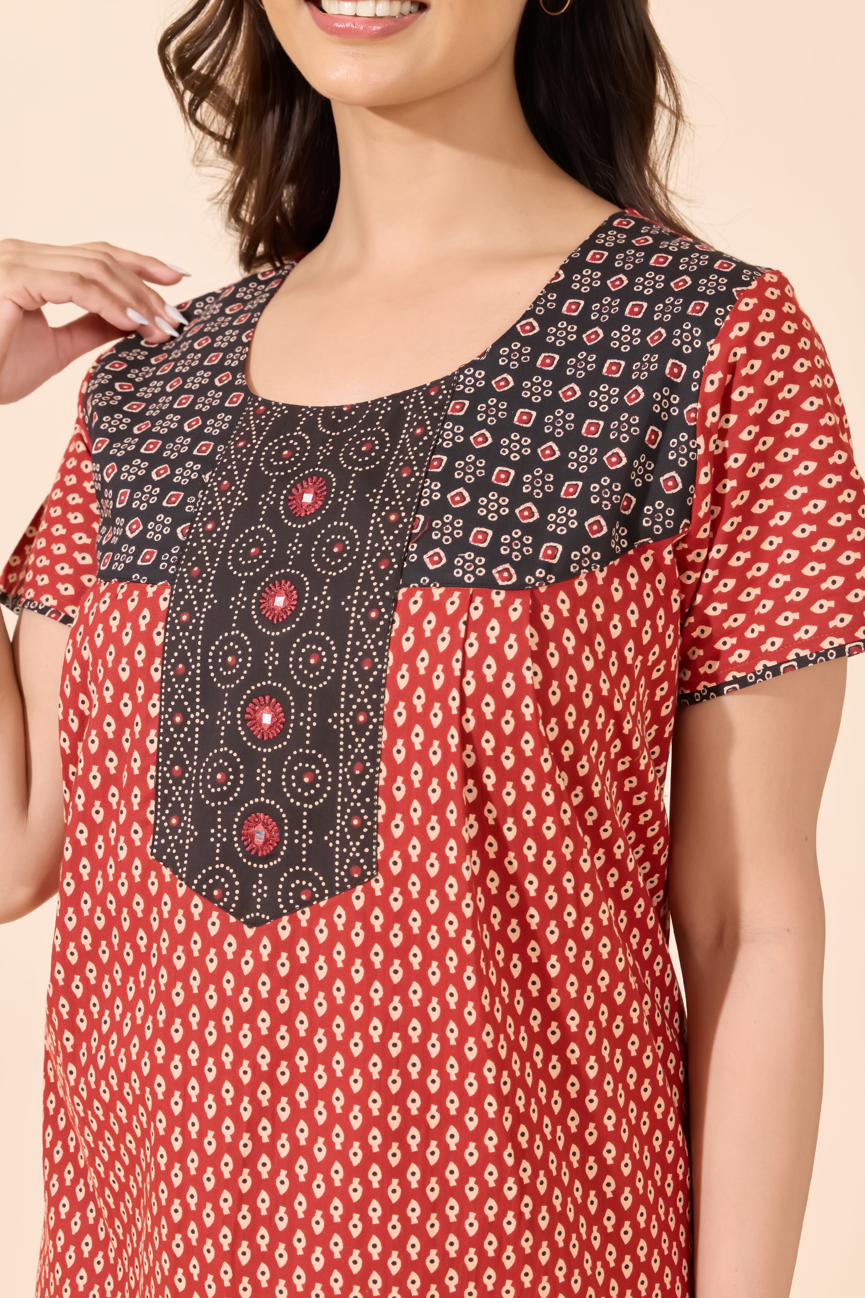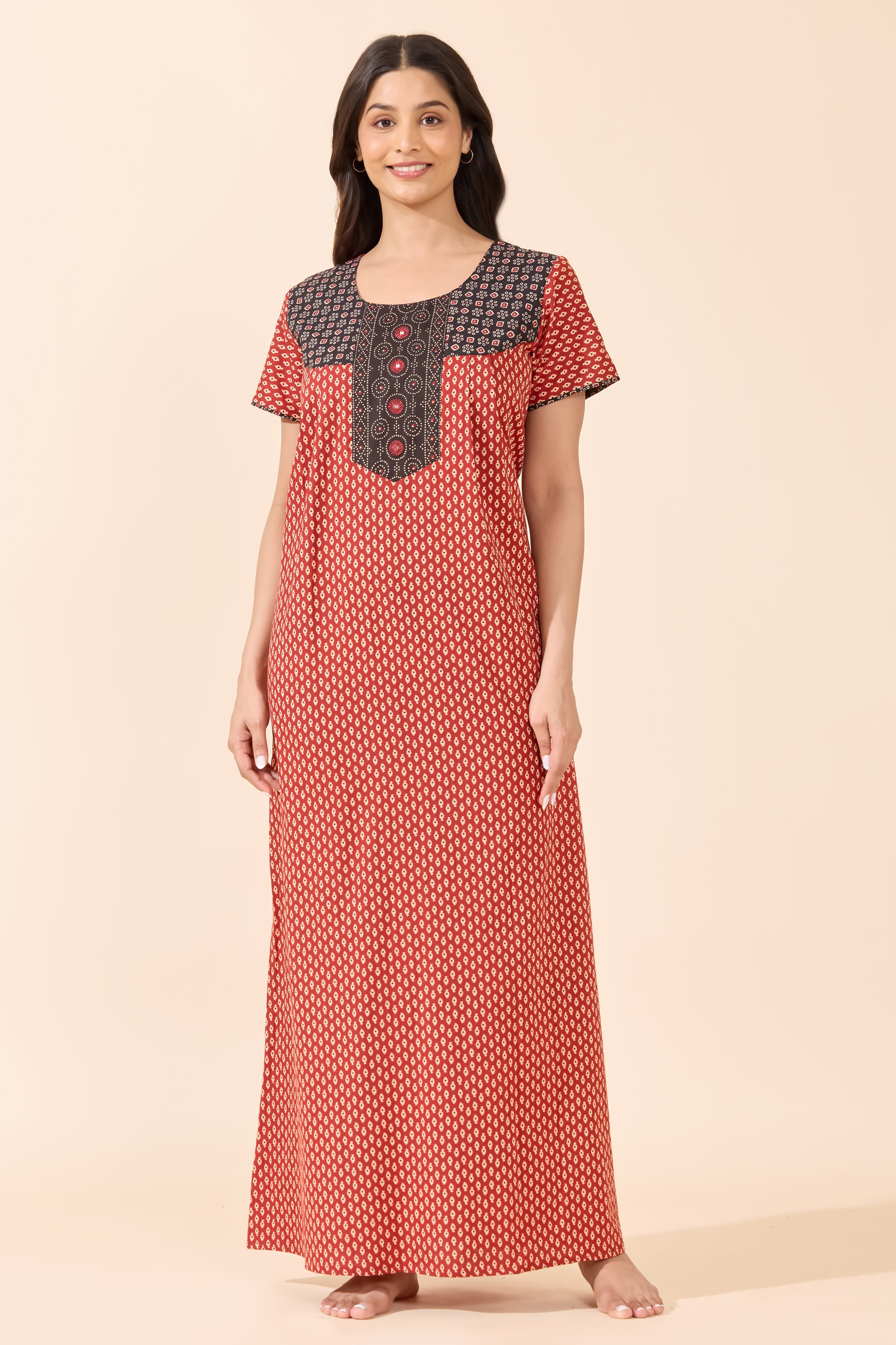 Add a touch of heritage to your nightwear with this maroon Bandhani print cotton nighty. Soft, breathable fabric and a relaxed fit make it ideal for everyday comfort and easy lounging.