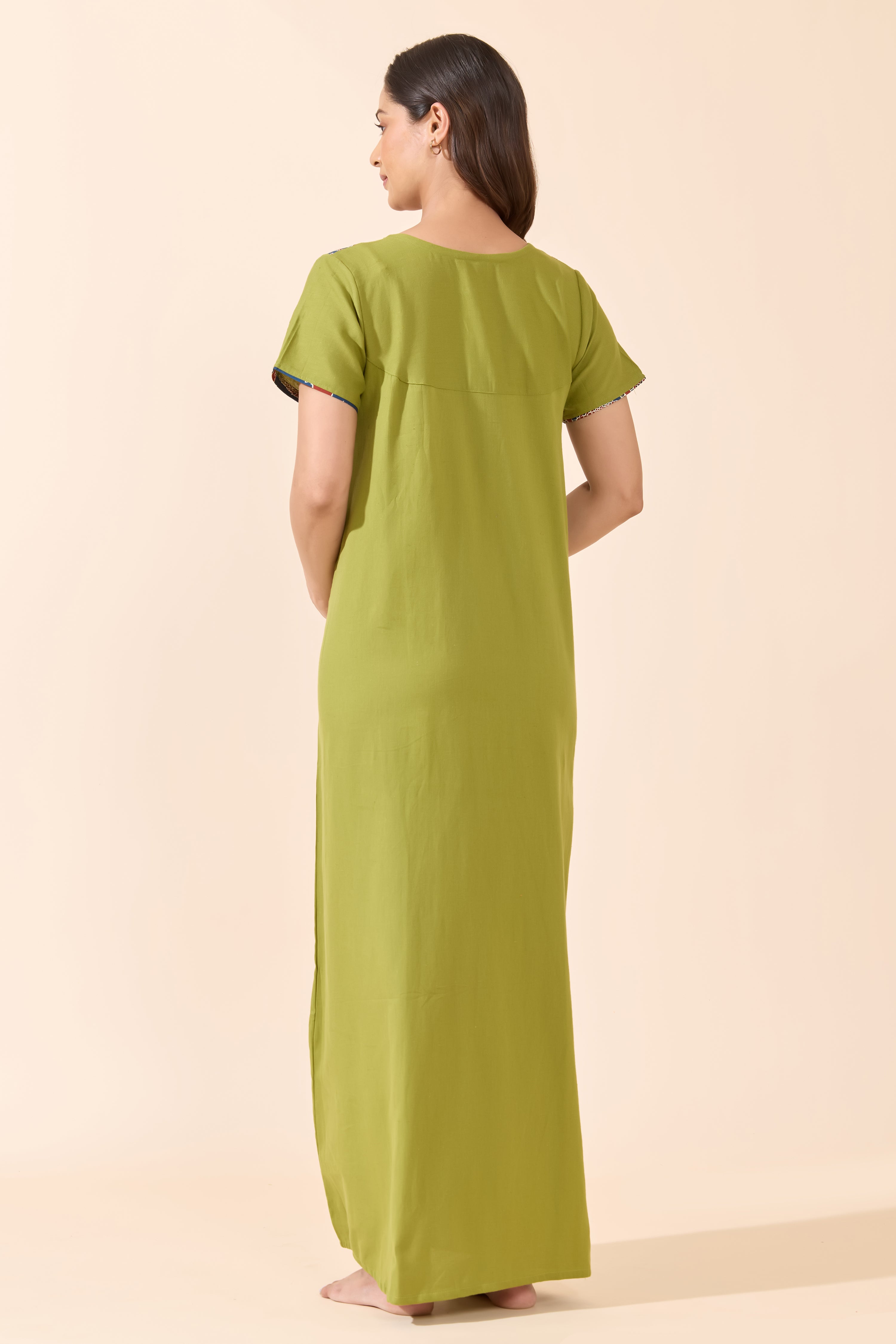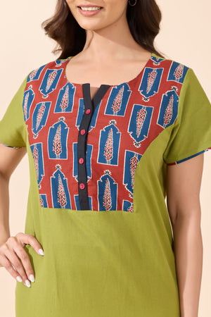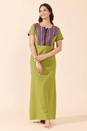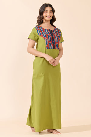 Enjoy all-day comfort with this green cotton nightwear featuring a delicate Mughal print yoke. Soft, breathable, and perfect for unwinding in style.