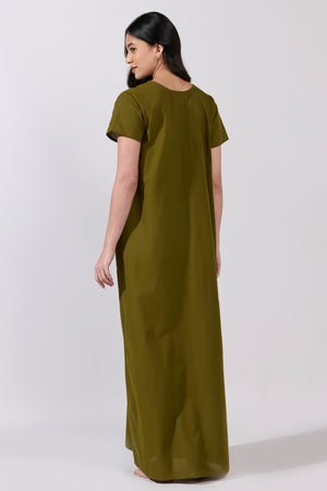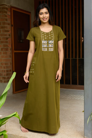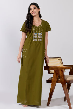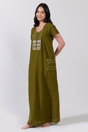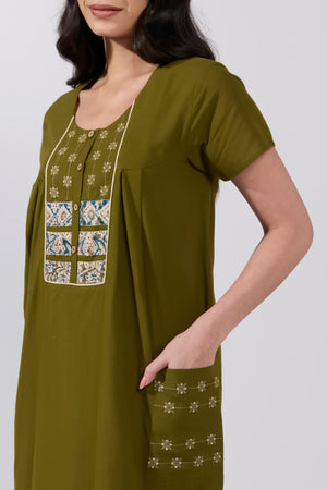 Solid green cotton nightwear detailed with a contrasting striped Kalamkari yoke. Featuring a scoop neckline, short sleeves, functional button closure, and a comfortable regular fit for easy, breathable wear.
