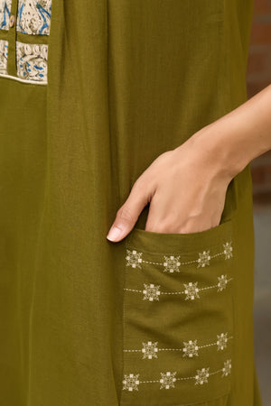 Green Solid Cotton Nightwear with Striped Kalamkari Yoke