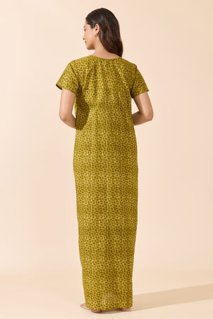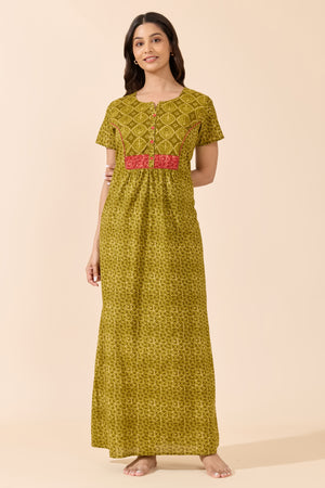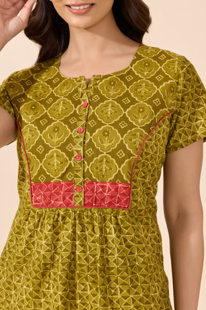 Green cotton nightwear with geometric prints and a contrast floral yoke, designed with a round neck and V-notch. Featuring short sleeves, a functional button placket, and a breathable regular fit.