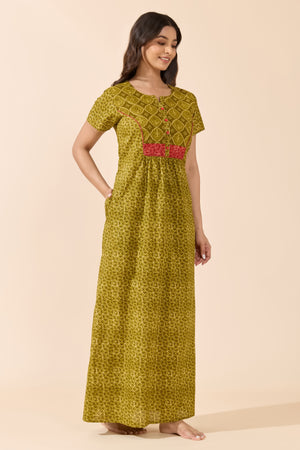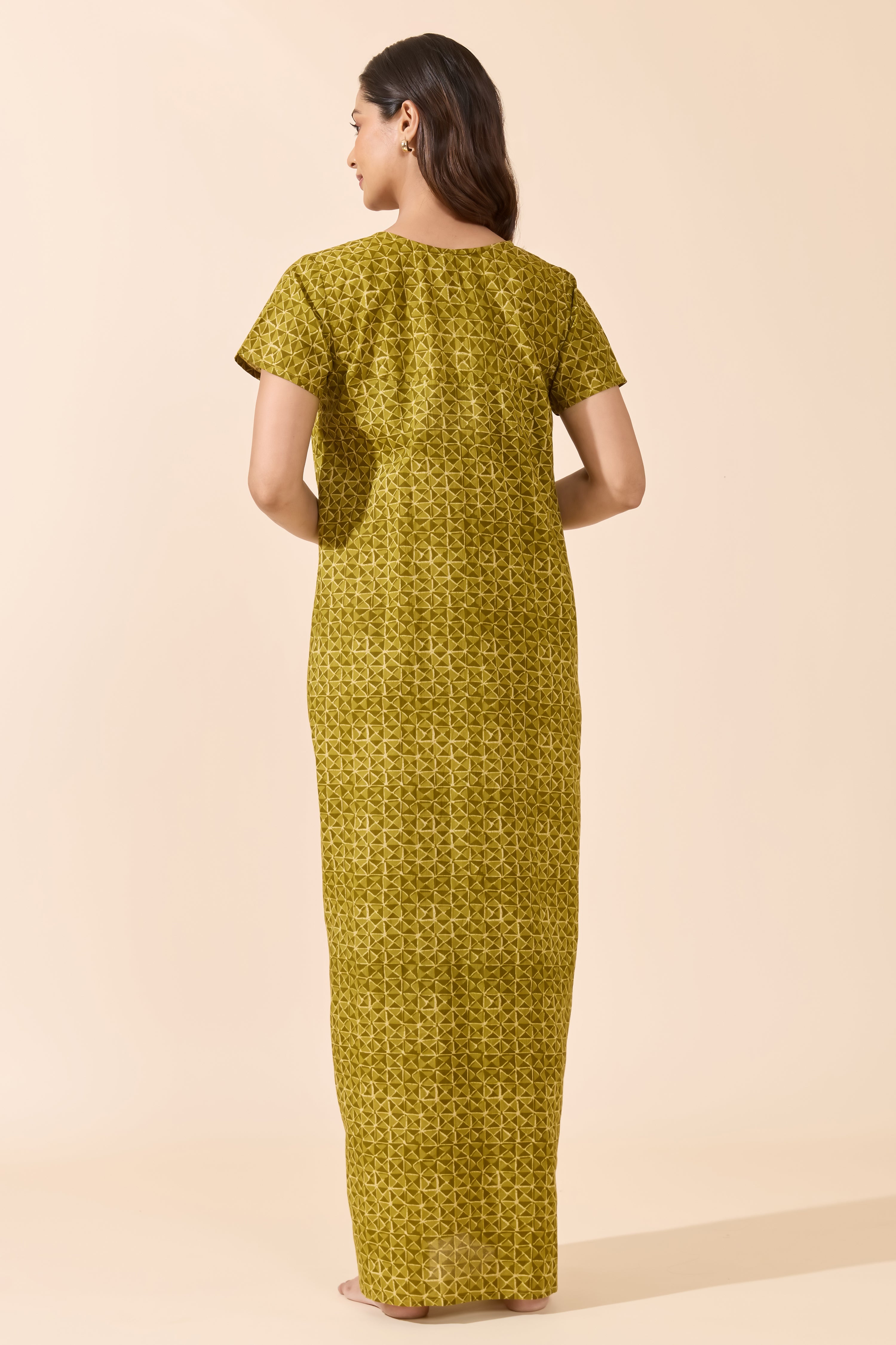 GREEN GEOMETRIC COTTON NIGHTWEAR WITH FLORAL YOKE