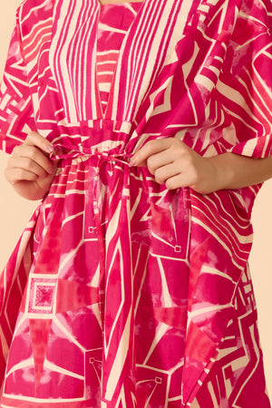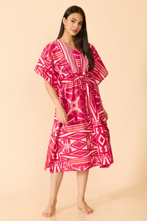 Pink cotton kaftan nightwear featuring abstract prints, designed with a V-neckline and statement square notch. Finished with half sleeves and a breezy, relaxed fit for effortless comfort.
