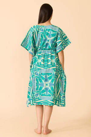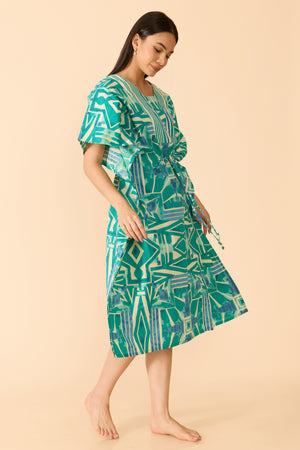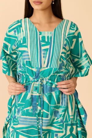 Turquoise cotton kaftan nightwear featuring abstract prints, designed with a V-neckline and statement square notch. Finished with half sleeves and a breezy, relaxed fit for effortless comfort.
