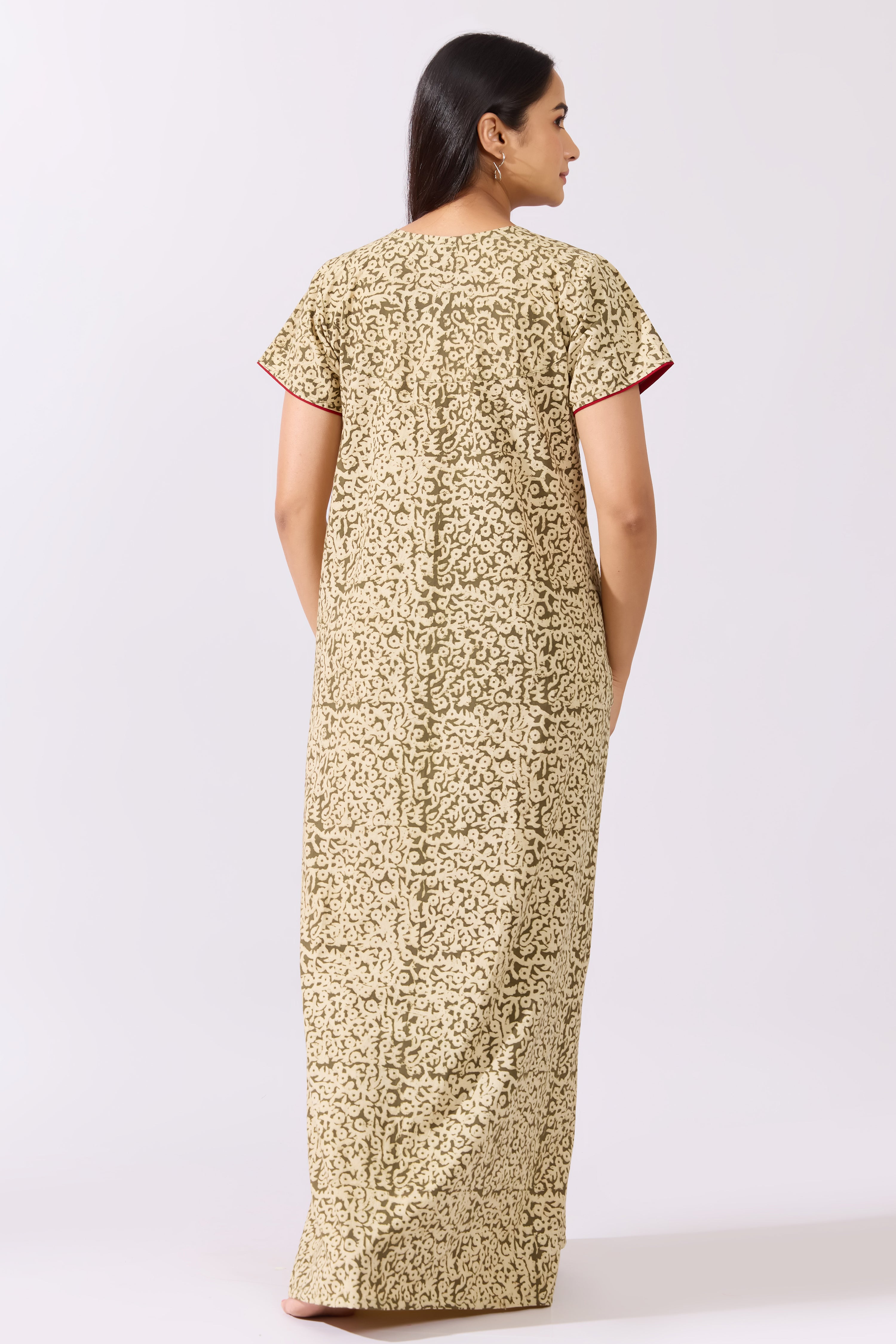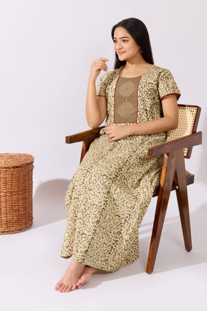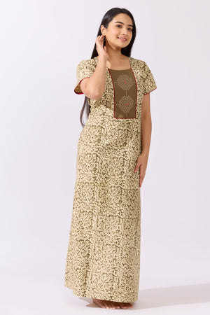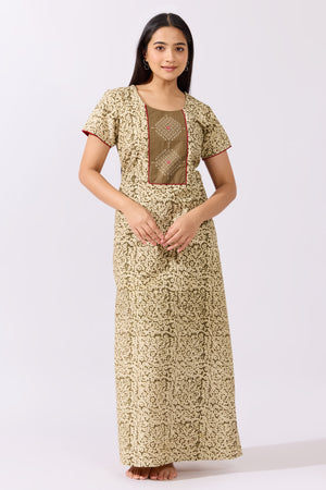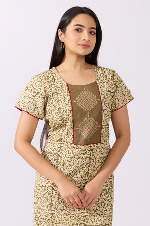 Green Kalamkari Nighty with Kolam Cross Stitch Embroidered Yoke