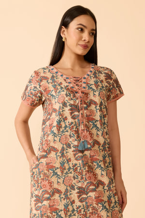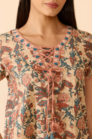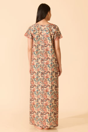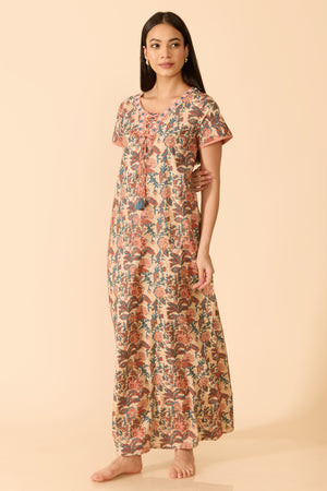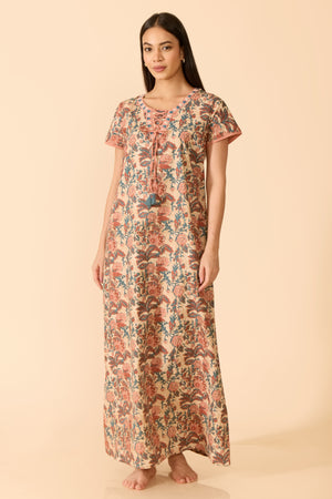 Peach cotton nightwear adorned with soft floral prints, designed with a scoop neckline and subtle V-notch detail. Featuring short sleeves, a delicate tie-up closure, and a breathable regular fit for everyday ease.