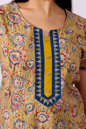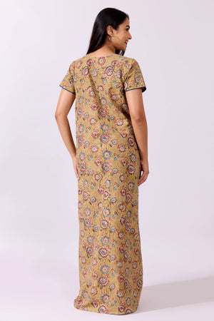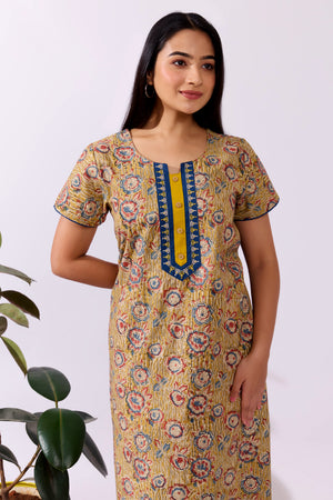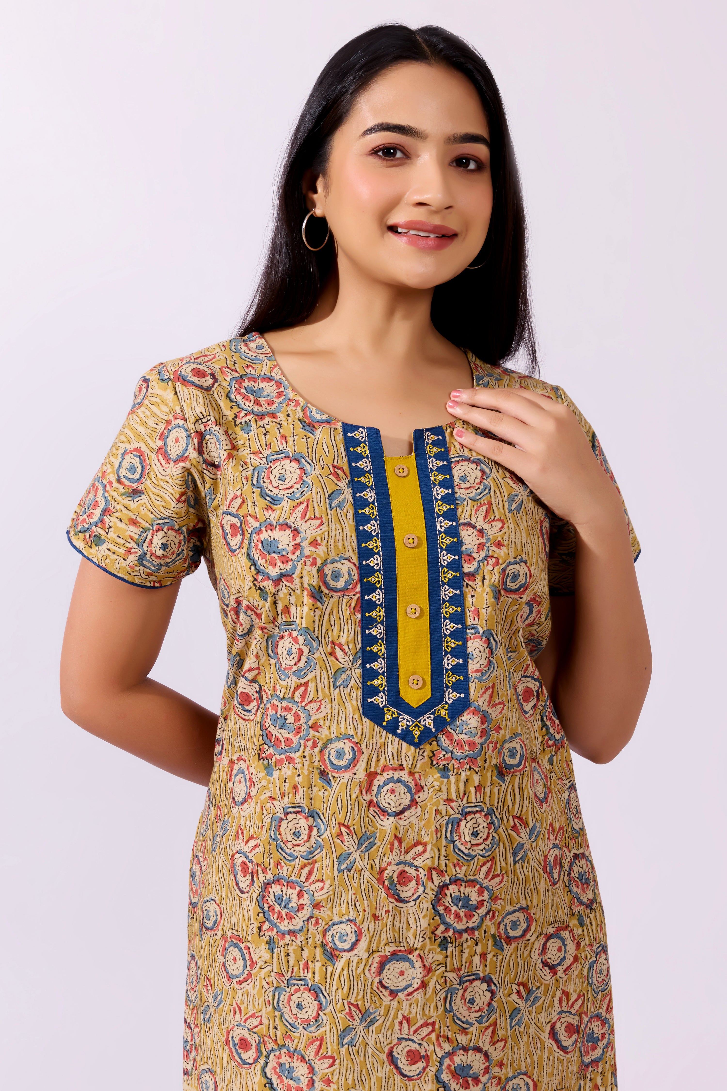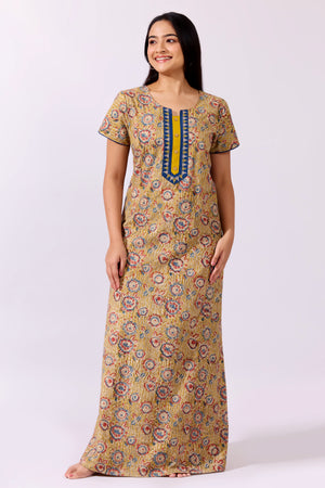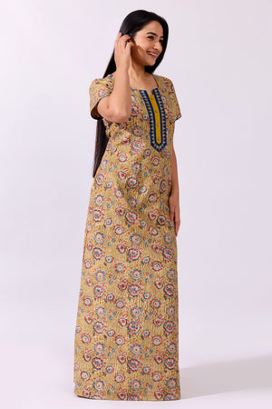 Floral Printd Purple Cotton Nighty ith Contrast Yoke Patchwork