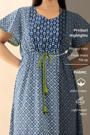 Indigo Printed Cotton Nighty with Waist Tie-up - Blue & Green