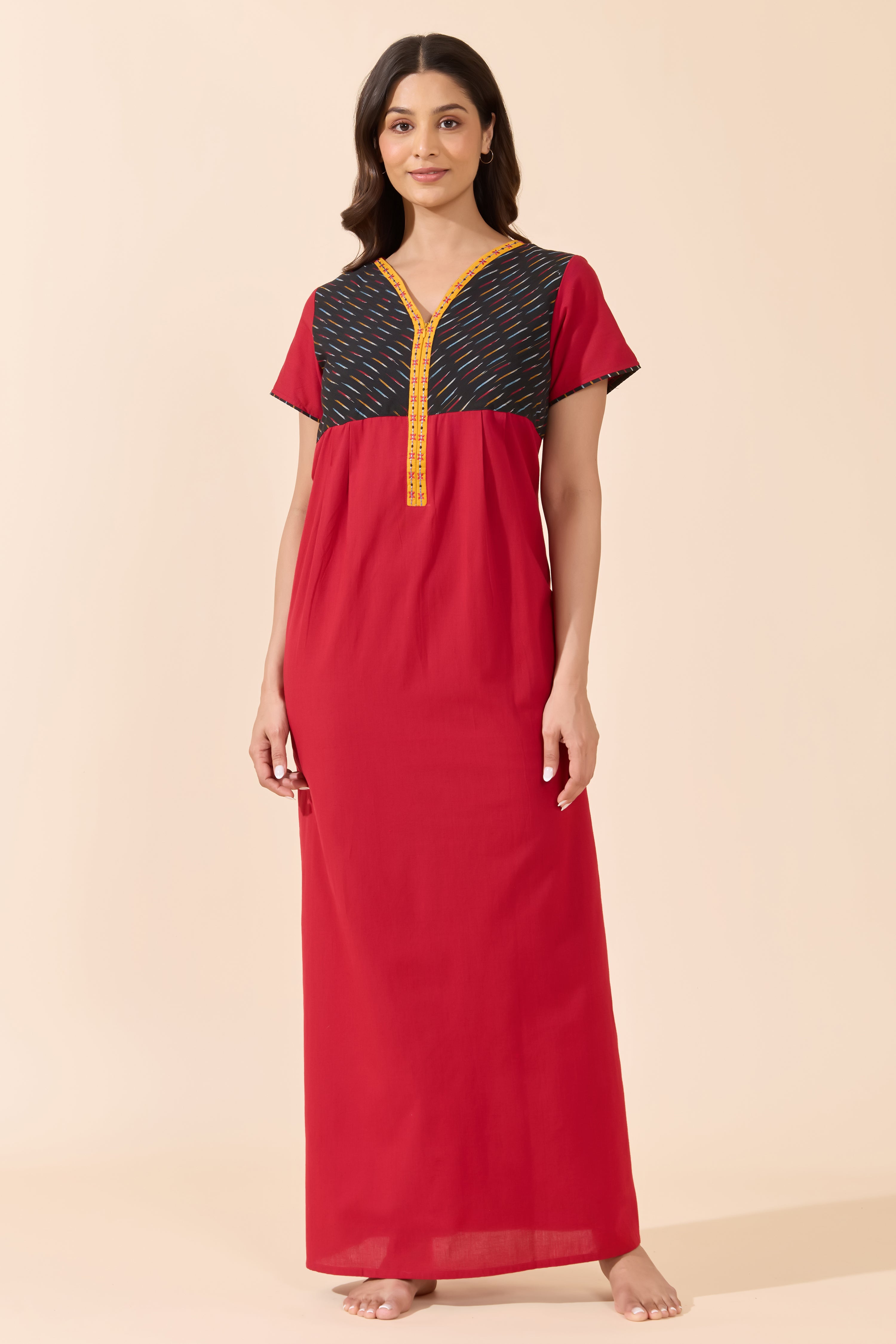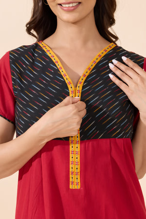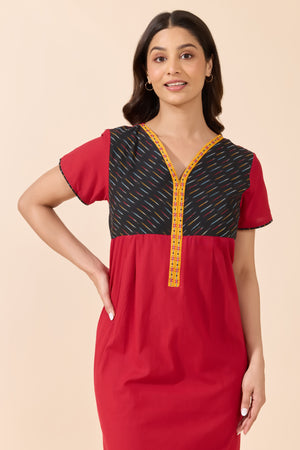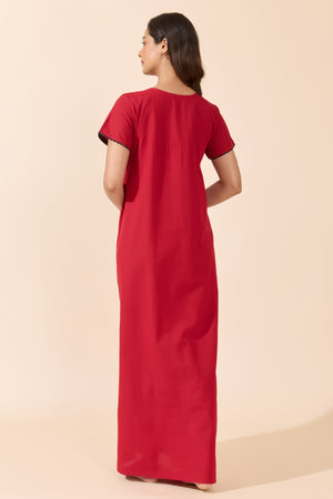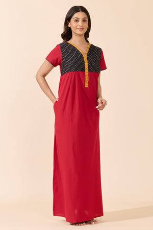 Red Solid Cotton Nightwear with Black Printed Yoke