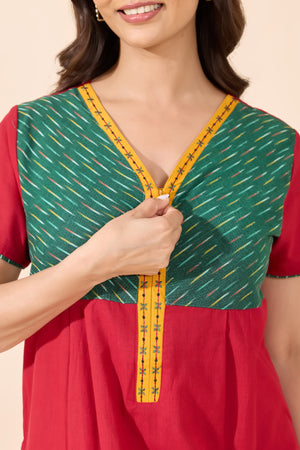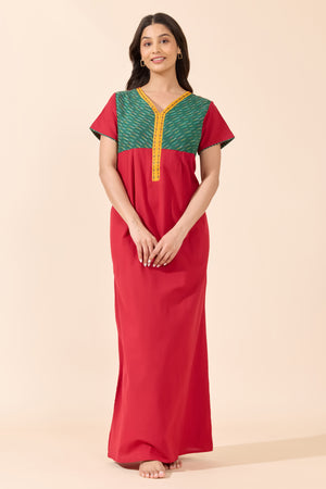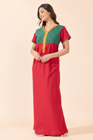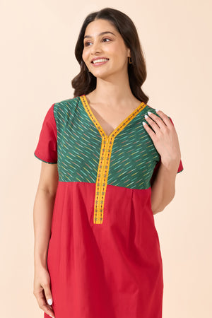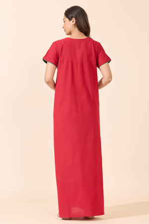 Red solid cotton nightwear featuring a modern stroke print detail. Crafted in soft, breathable fabric with a V-neck, front zipper closure and a comfortable regular fit for effortless daily wear.