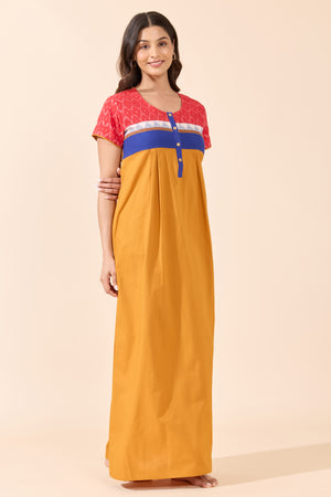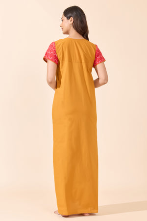 Mustard Solid Cotton Nightwear with Ikat Print