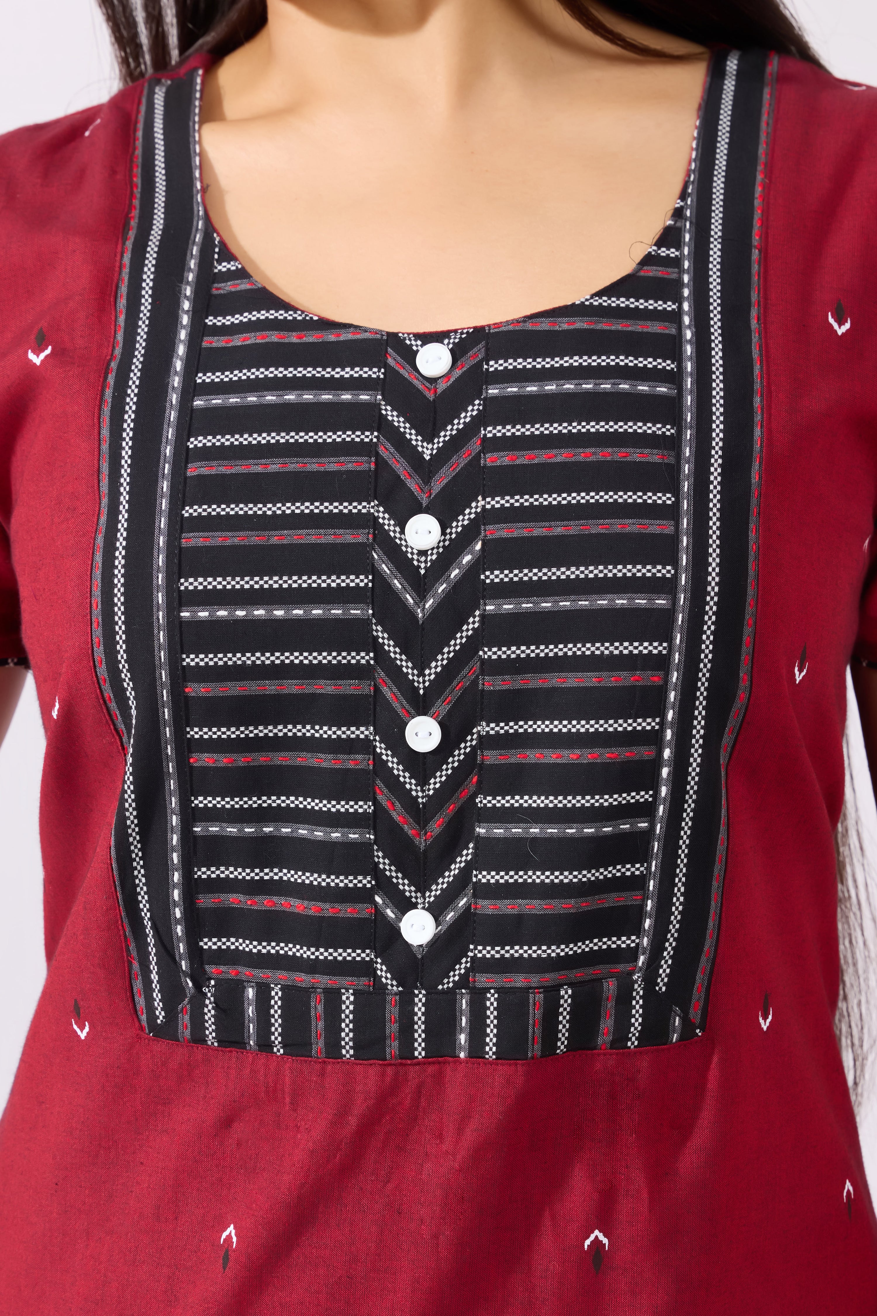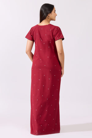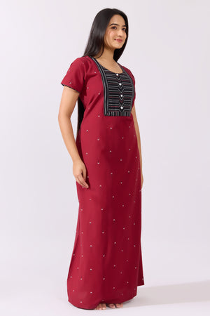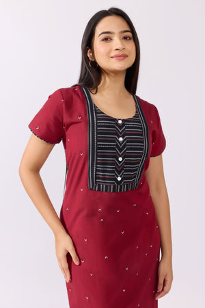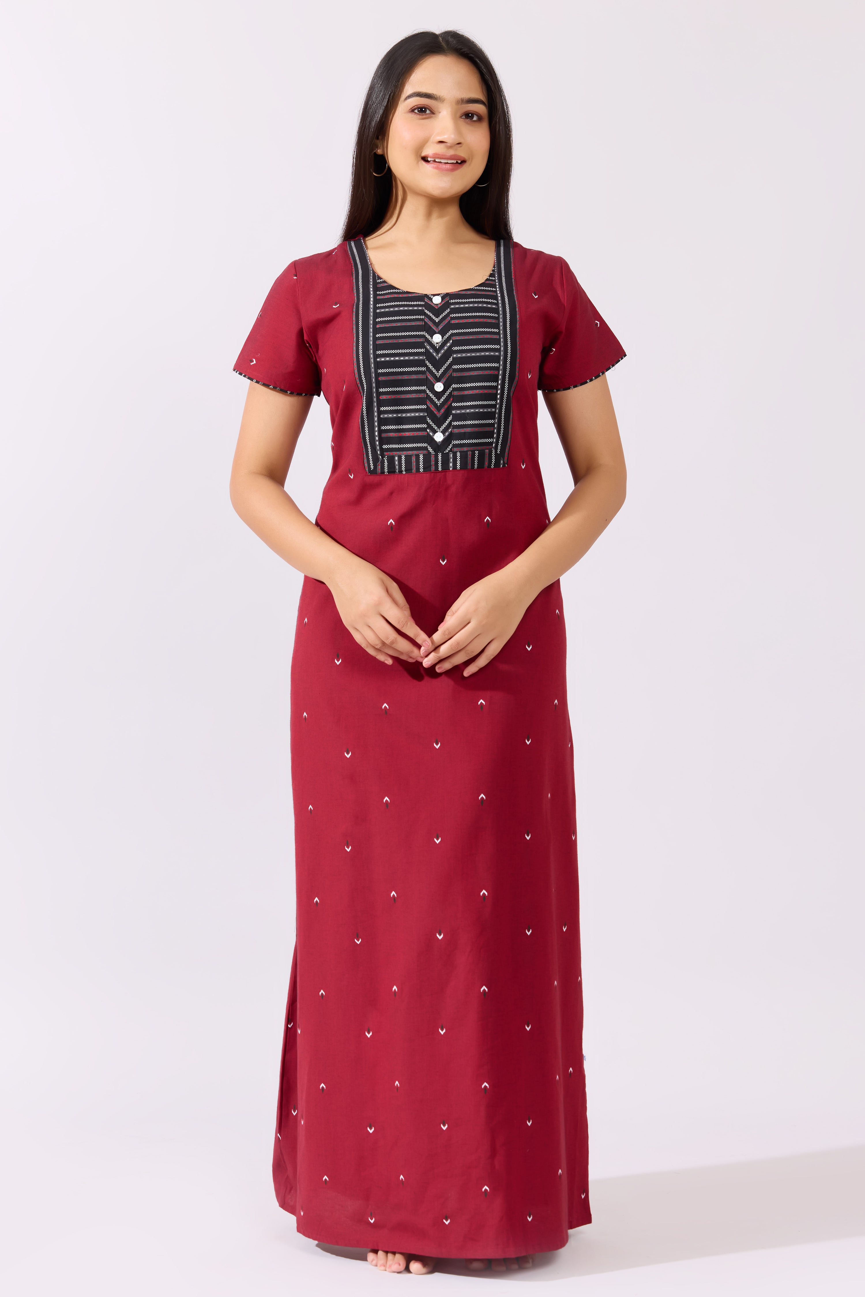 Maroon Cotton Nighty with Dobby Yoke Patchwork