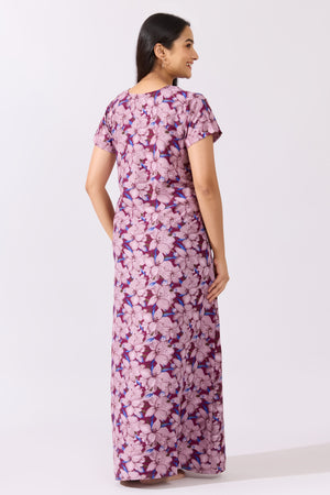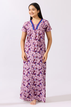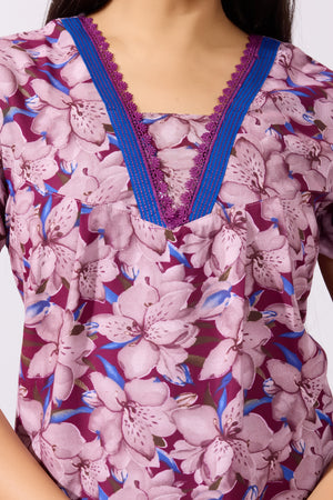 Floral Printed Purple Nighty with Lace Embellished Neckline
