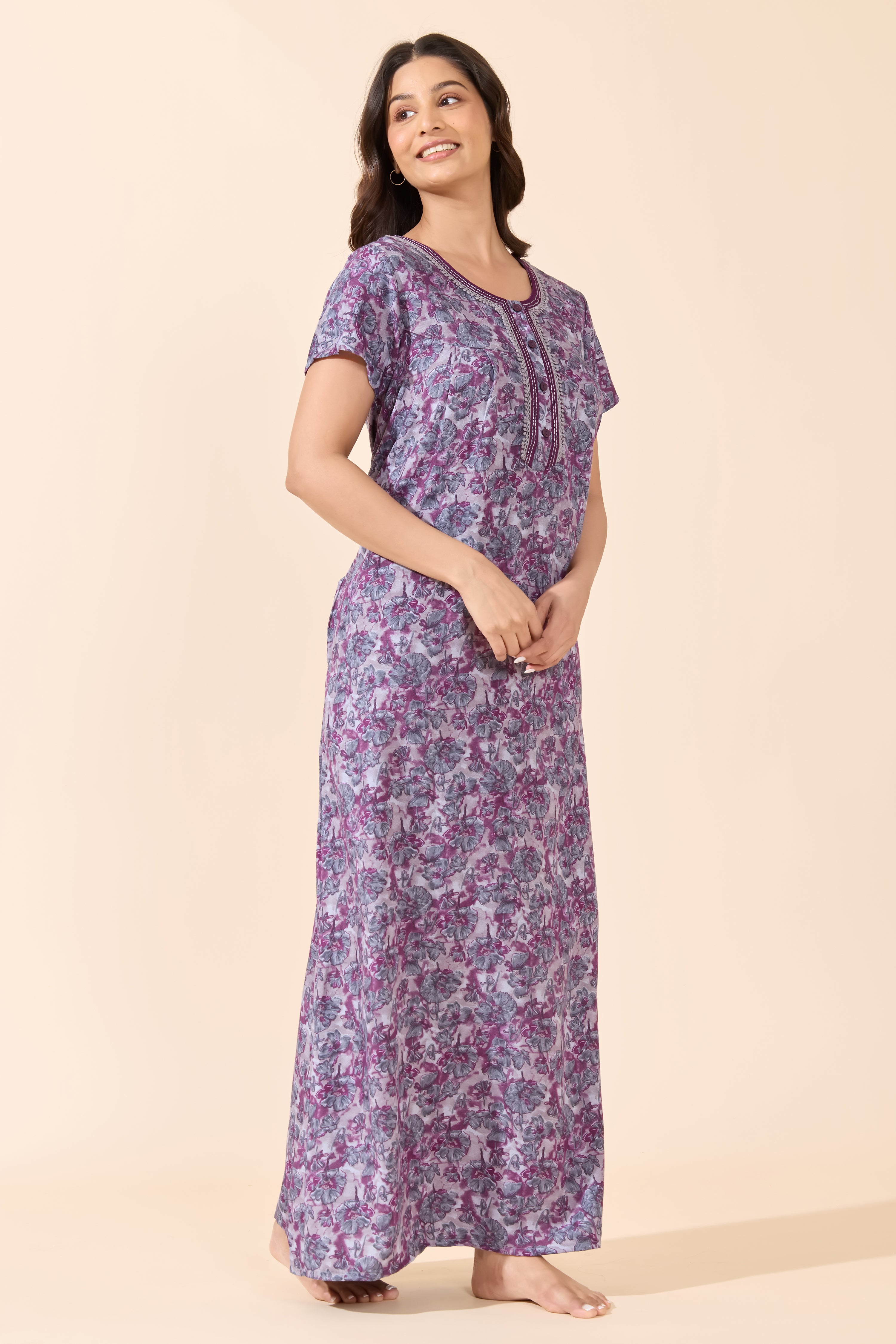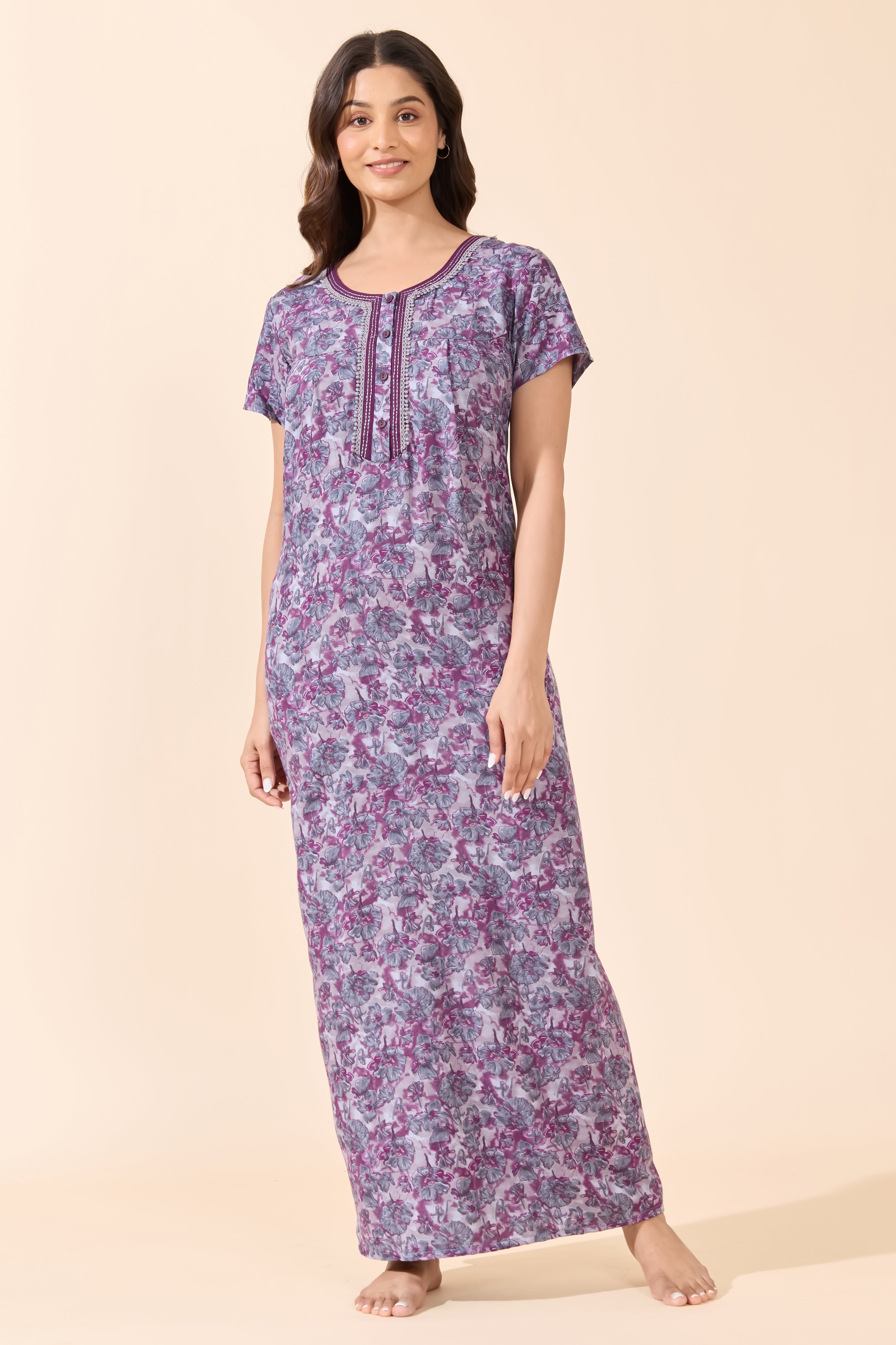 Refresh your nightwear collection with this purple floral printed cotton nightwear featuring a coordinated printed yoke. Crafted from soft, breathable cotton for everyday comfort and easy sleep.