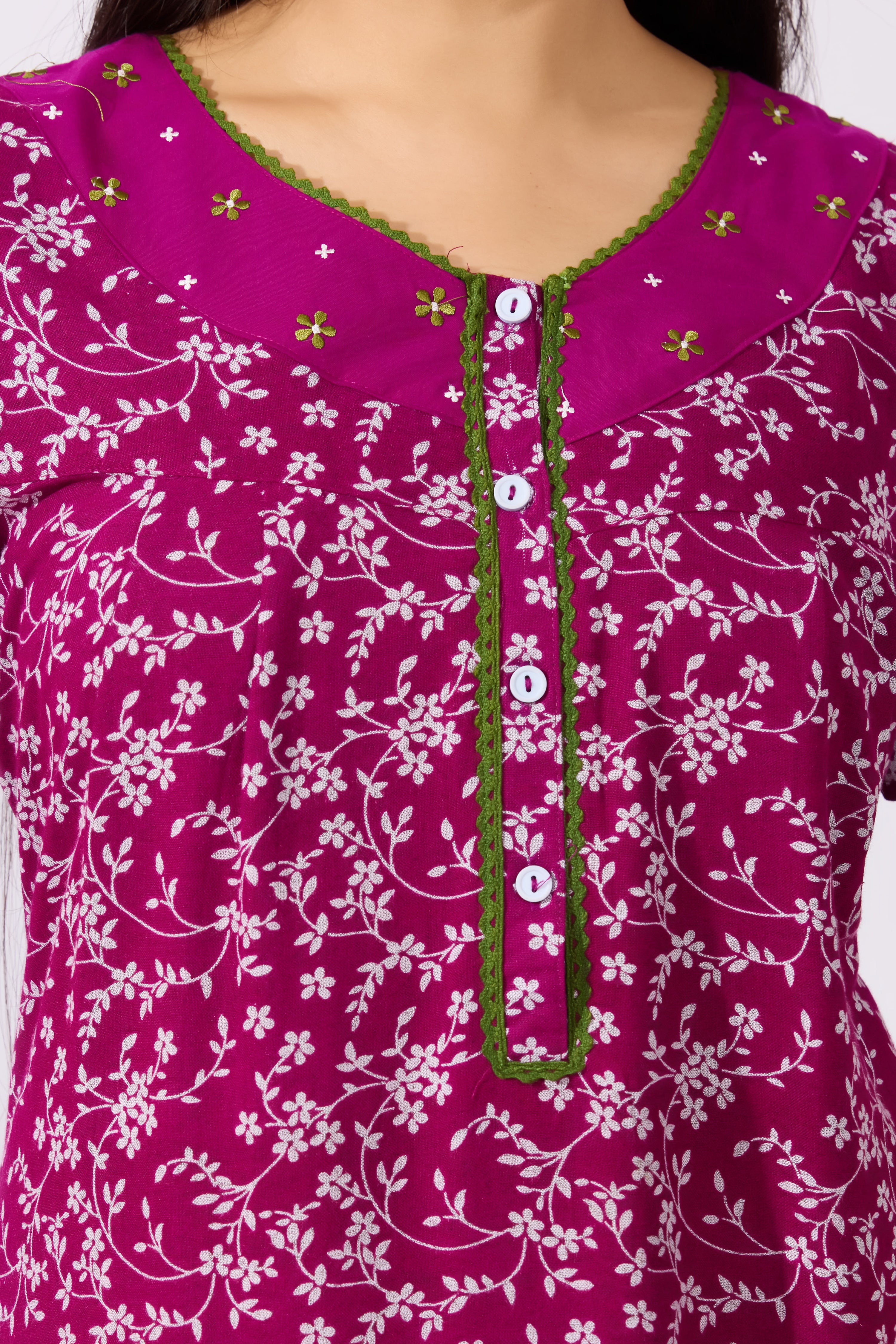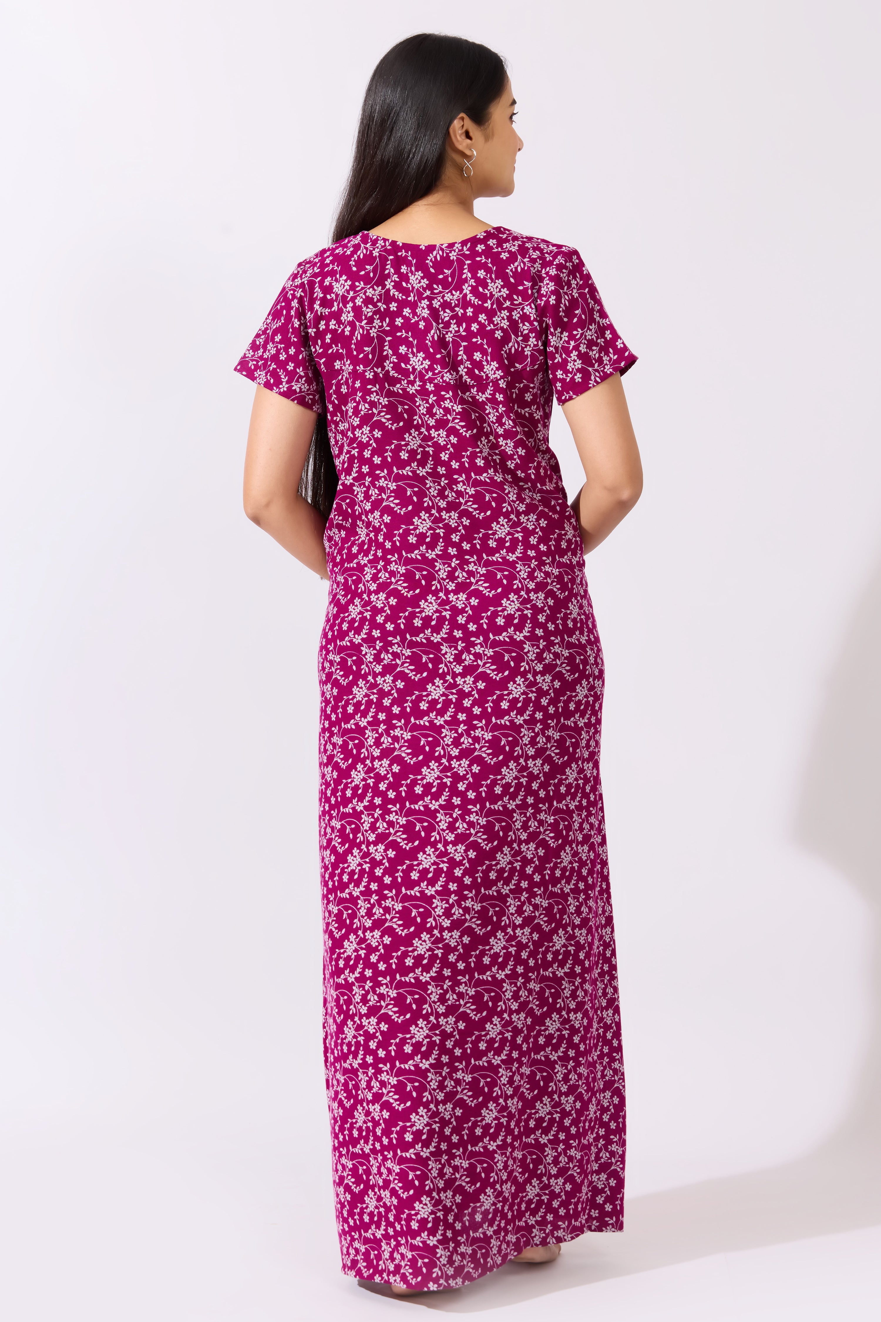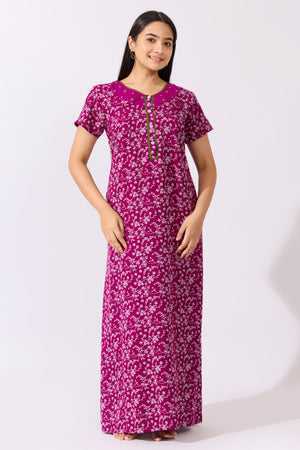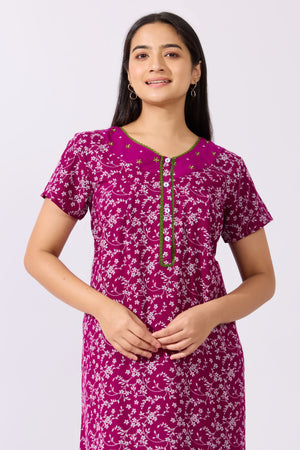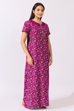 Ditsy Floral Printed Purple Nighty with Front Open Button