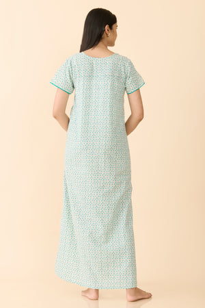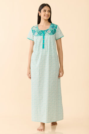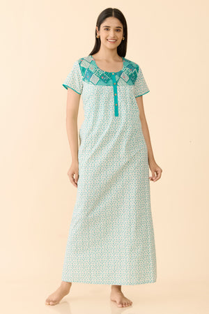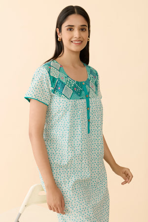 Turquoise Floral Cotton Nightwear with Patchwork Yoke