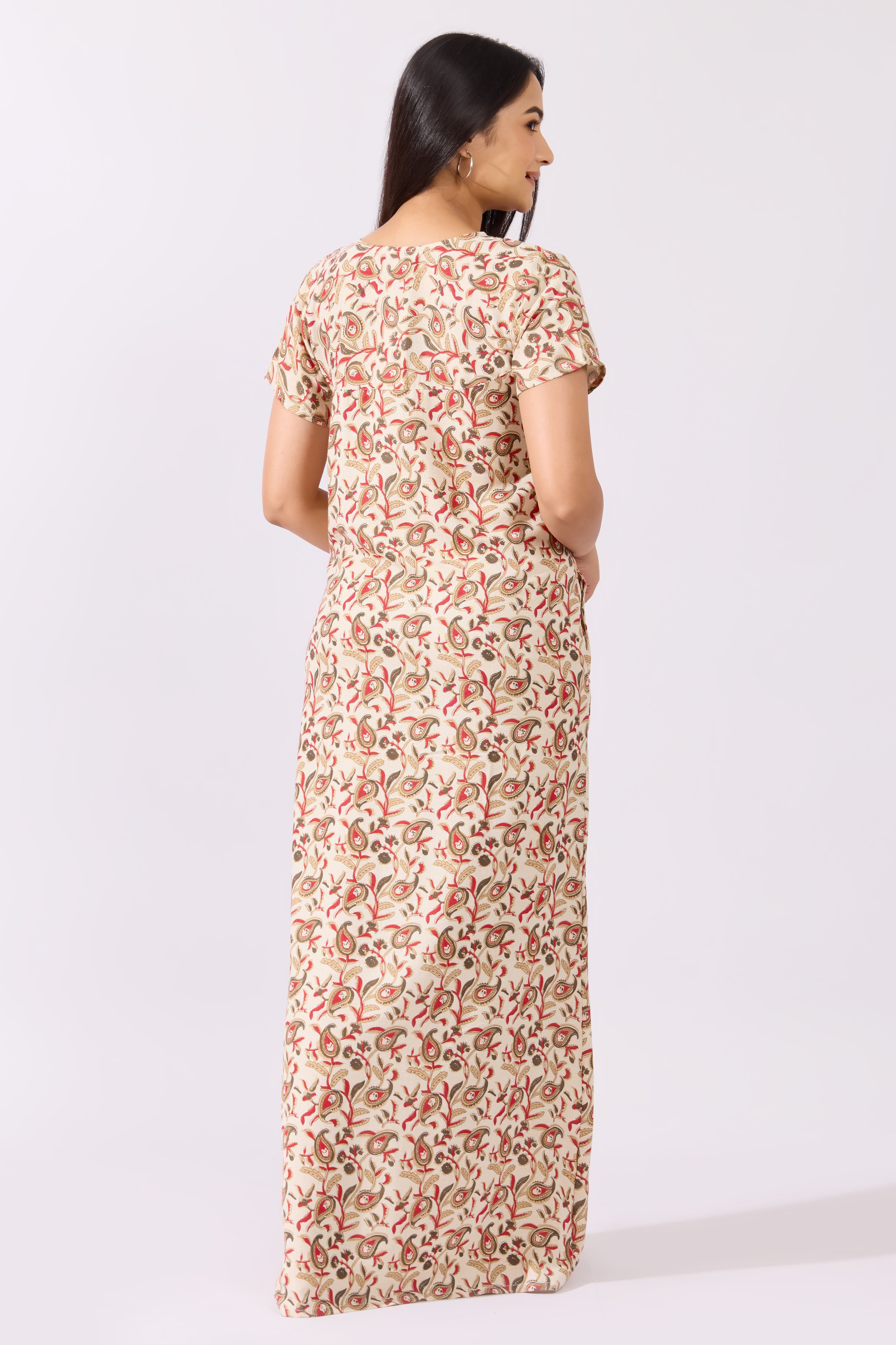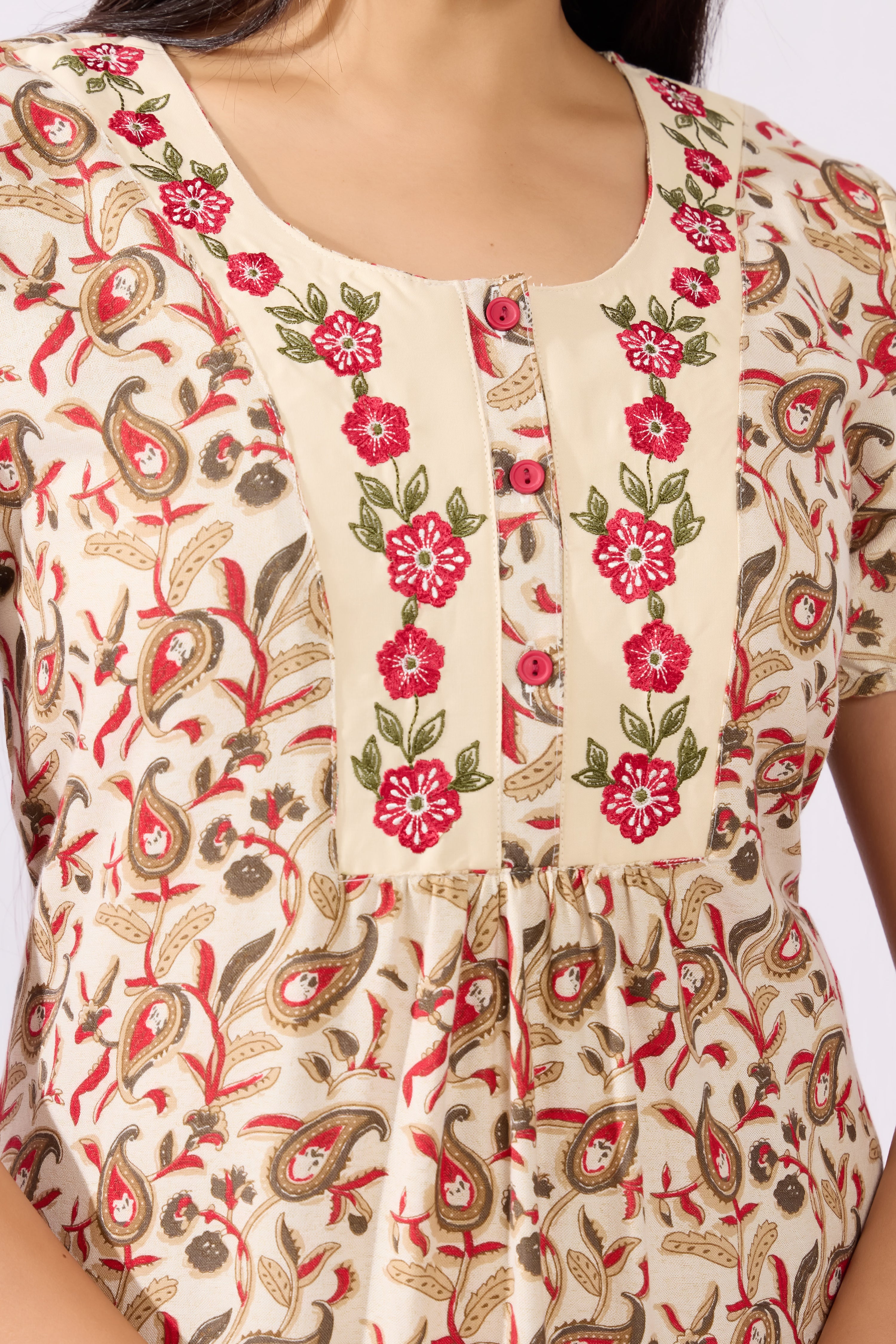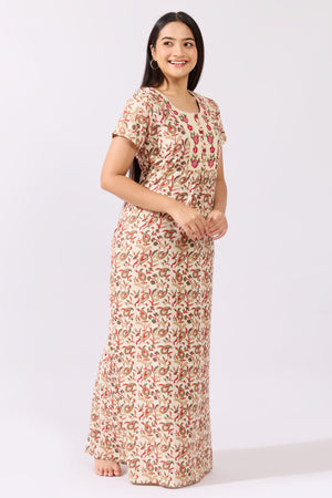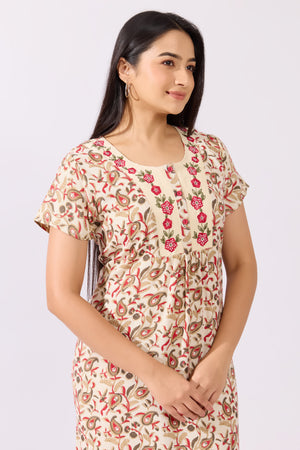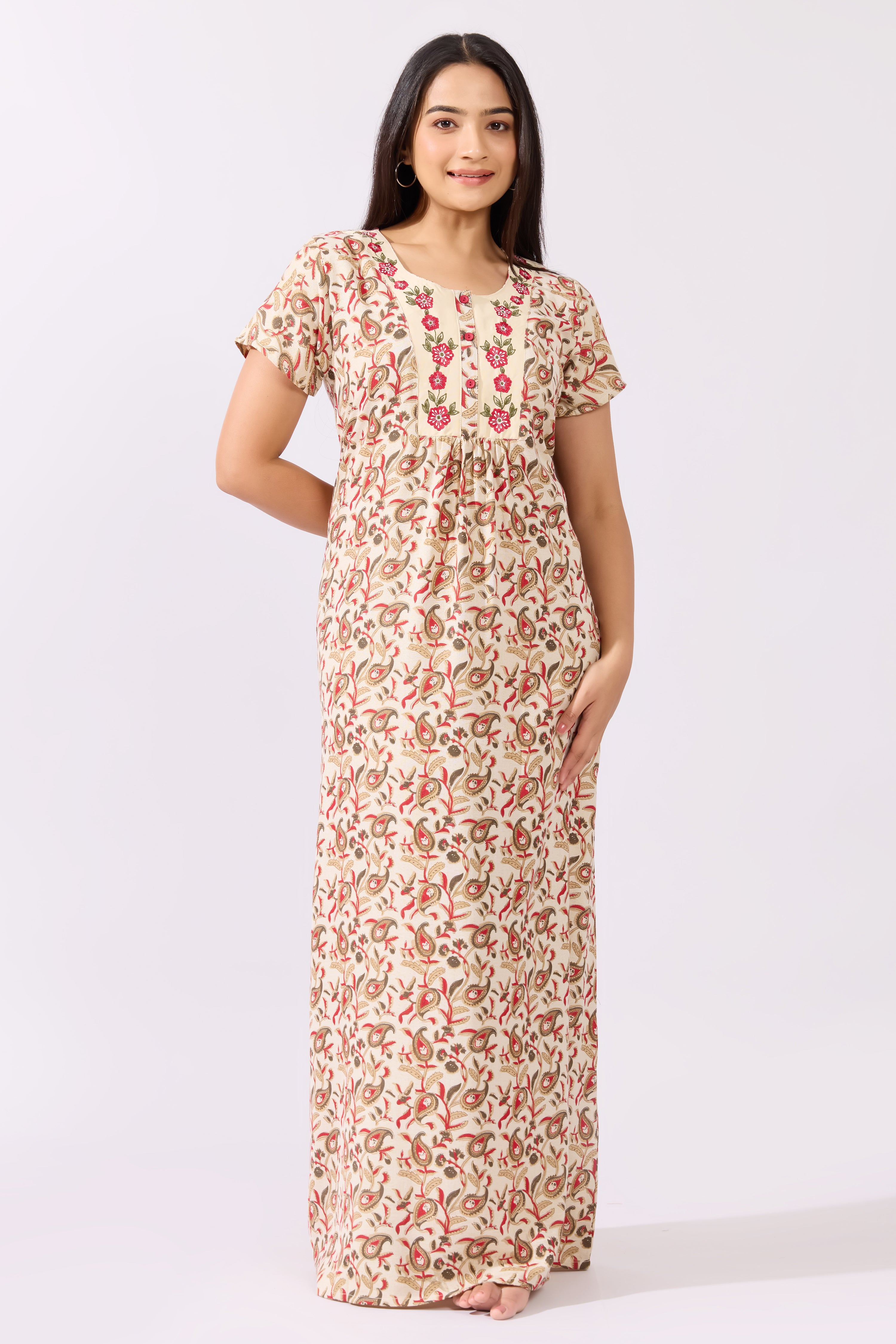 Paisley Printed Beige Nighty with Floral Embroidered Yoke