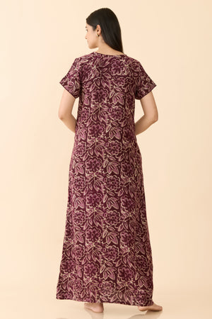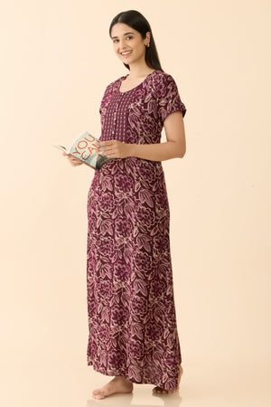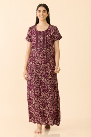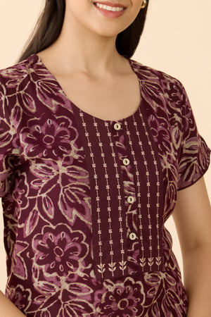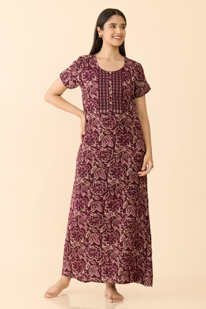 Purple Floral Cotton Nightwear with Striped Embroidered Yoke