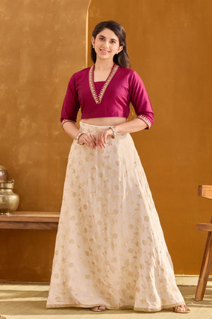 White circular brocade skirt with lining, featuring garden gold floral motifs and a dainty lace border for an elegant festive vibe. Finished with a drawstring and back elastic for a regular fit — skirt only, top shown is for styling and sold separately.
