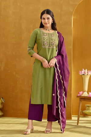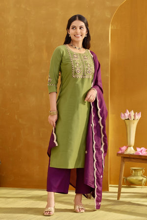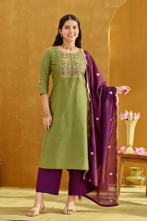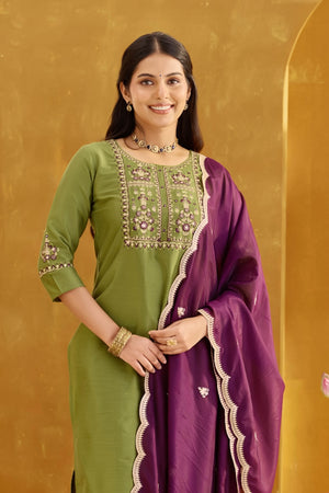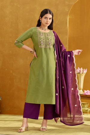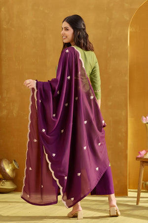Add elegance to festive dressing with this olive green straight-line kurta set, adorned with embroidery and foil mirror work. Paired with purple viscose bottoms and a chanderi dupatta, this outfit is perfect for Diwali celebrations and special occasions.