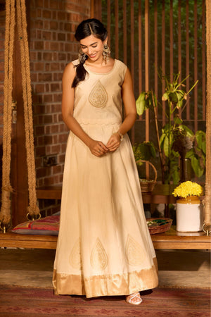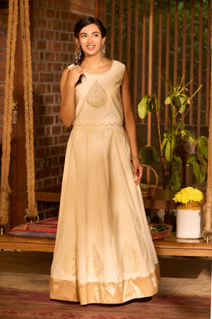 Celebrate Onam in style with this off-white Kathakali skirt set featuring golden threadwork, kasavu detailing, and soft cotton lining for all-day festive comfort.