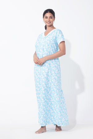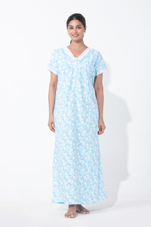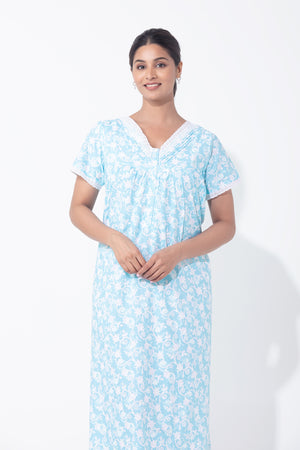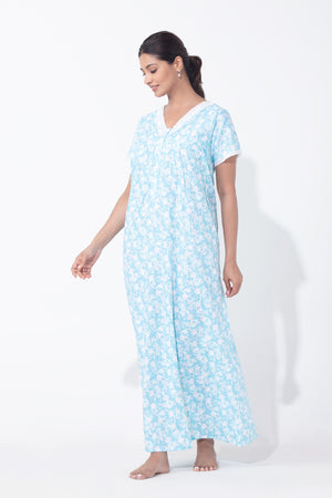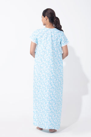 Pastel blue printed nighty in lightweight poly cotton, featuring front-open buttons for ease and feeding-friendly comfort—finished with delicate lace on the neckline and sleeves for a soft look.