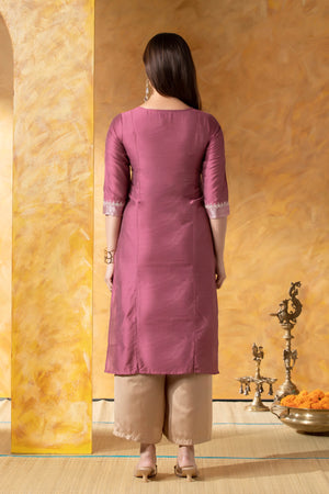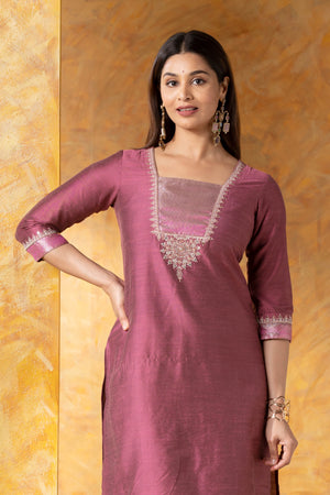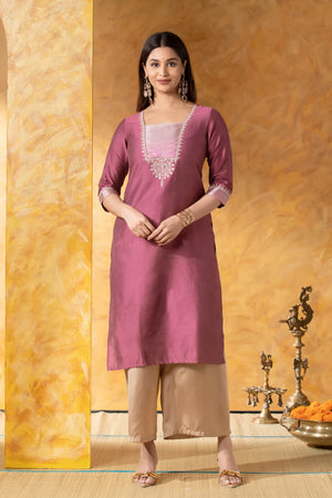 Look graceful in this pink straight-line kurta featuring a stylish square neck, intricate embroidery, and a brocade yoke. Made from silky slub fabric, this elegant outfit is perfect for Diwali celebrations and festive gatherings.