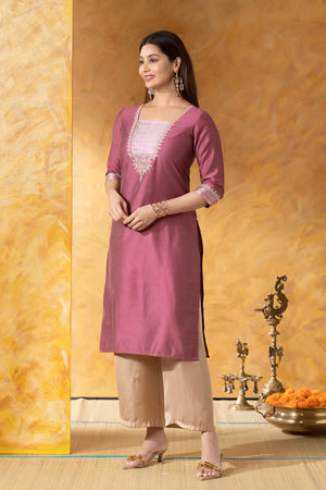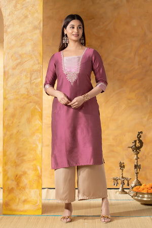 Pink Straight Kurta with Embroidery and Brocade Yoke