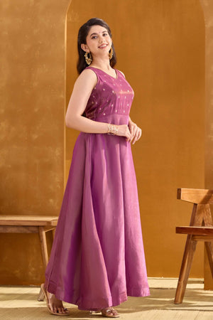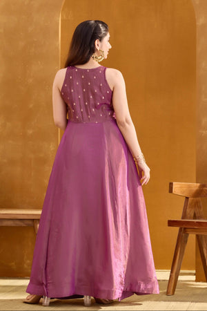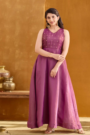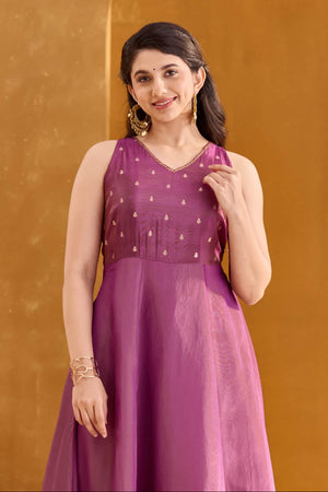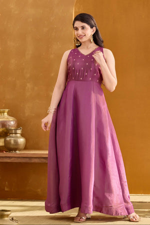 Dazzle this festive season in a purple A-line Anarkali featuring intricate embroidery with sequin accents. Designed with a V-neck and sleeveless style in shimmer fabric with crepe lining, it’s perfect for Diwali celebrations and special occasions.