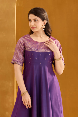 Step into elegance with this purple A-line Anarkali featuring a brocade yoke and delicate golden thread work. Crafted in silky slub with cotton-lined yoke, this festive wear ensures comfort and style for Diwali and wedding occasions.