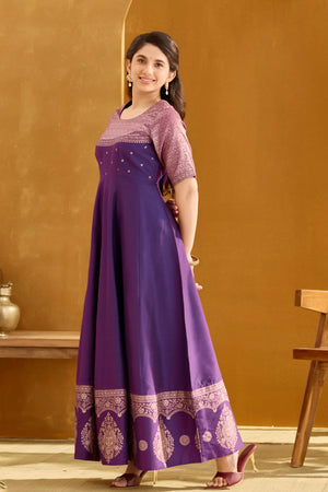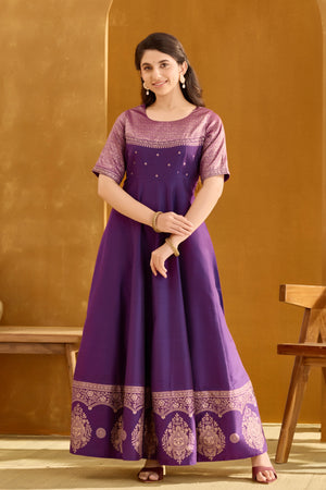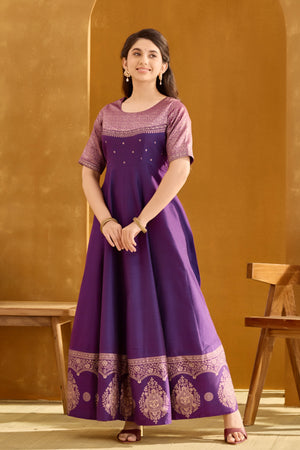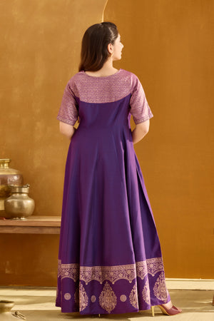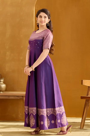 Purple Anarkali with Brocade Design On Sleeves & Yoke & Golden Printed Border