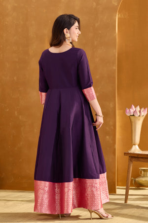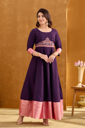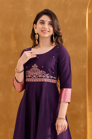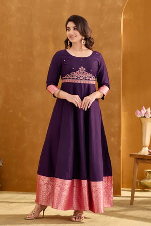 Step into festive elegance with this purple Anarkali. Brocade detailing, intricate embroidery, and foil mirror work make it perfect for celebrations, while soft fabric ensures all-day comfort.