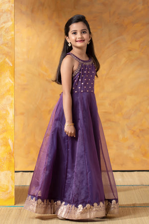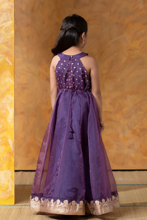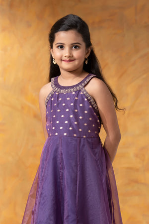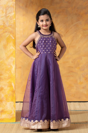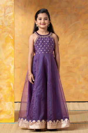Purple Brocade Kids Anarkali with Halter Neck