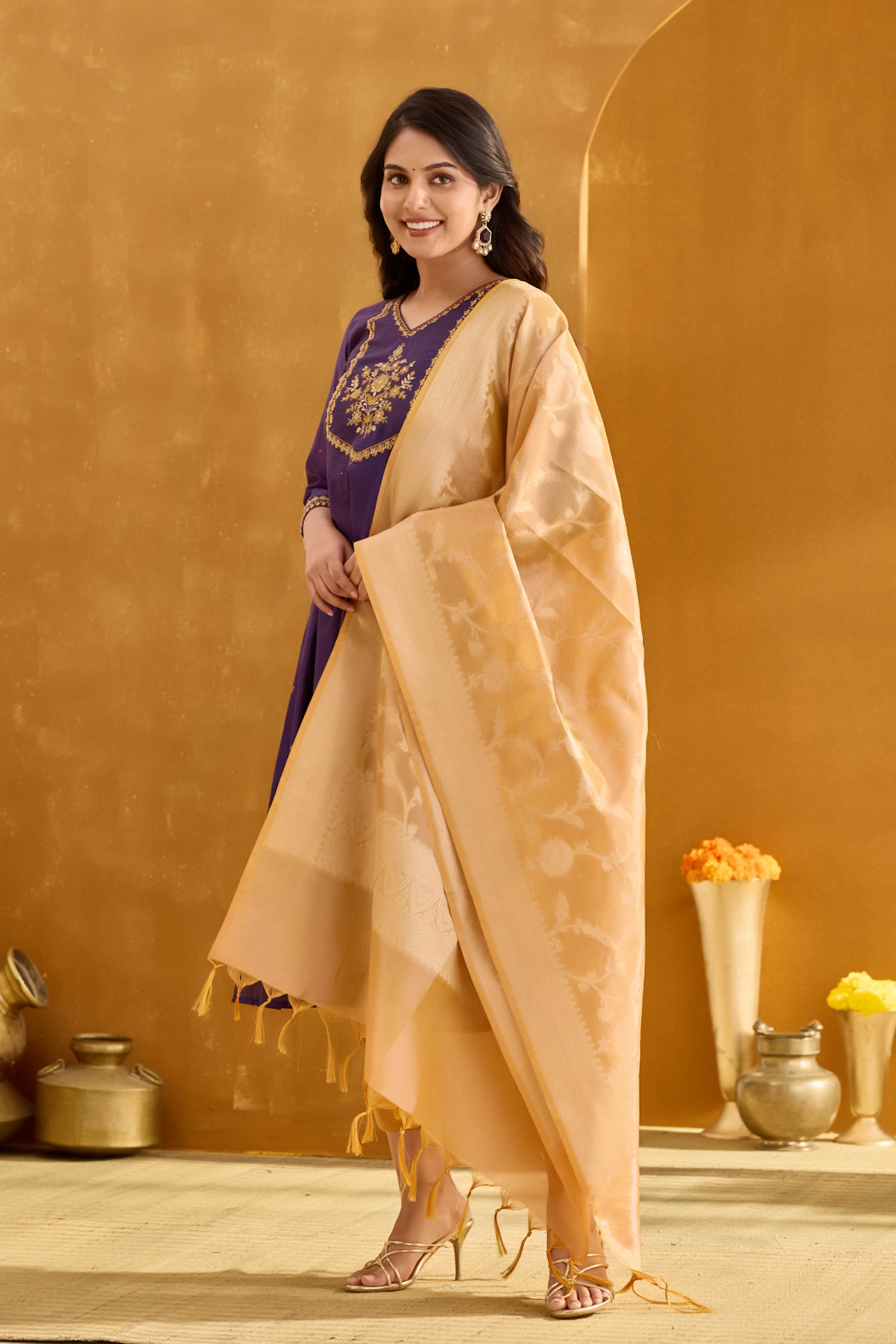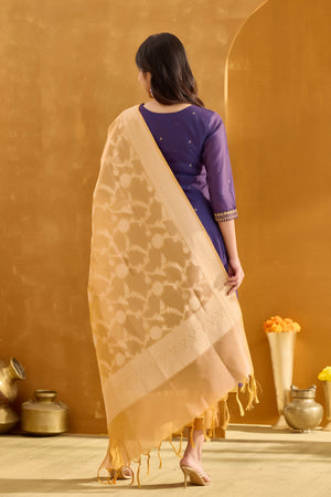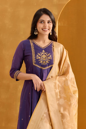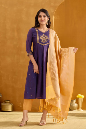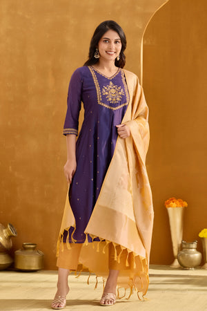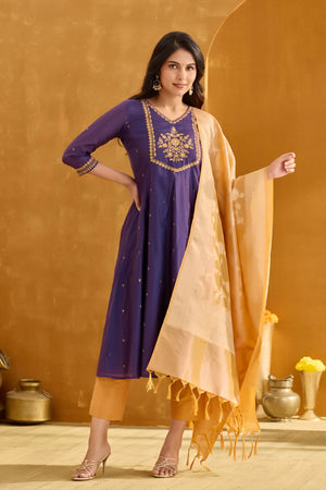 Purple Chanderi Kurta Set with Embroidered Yoke & Dupatta