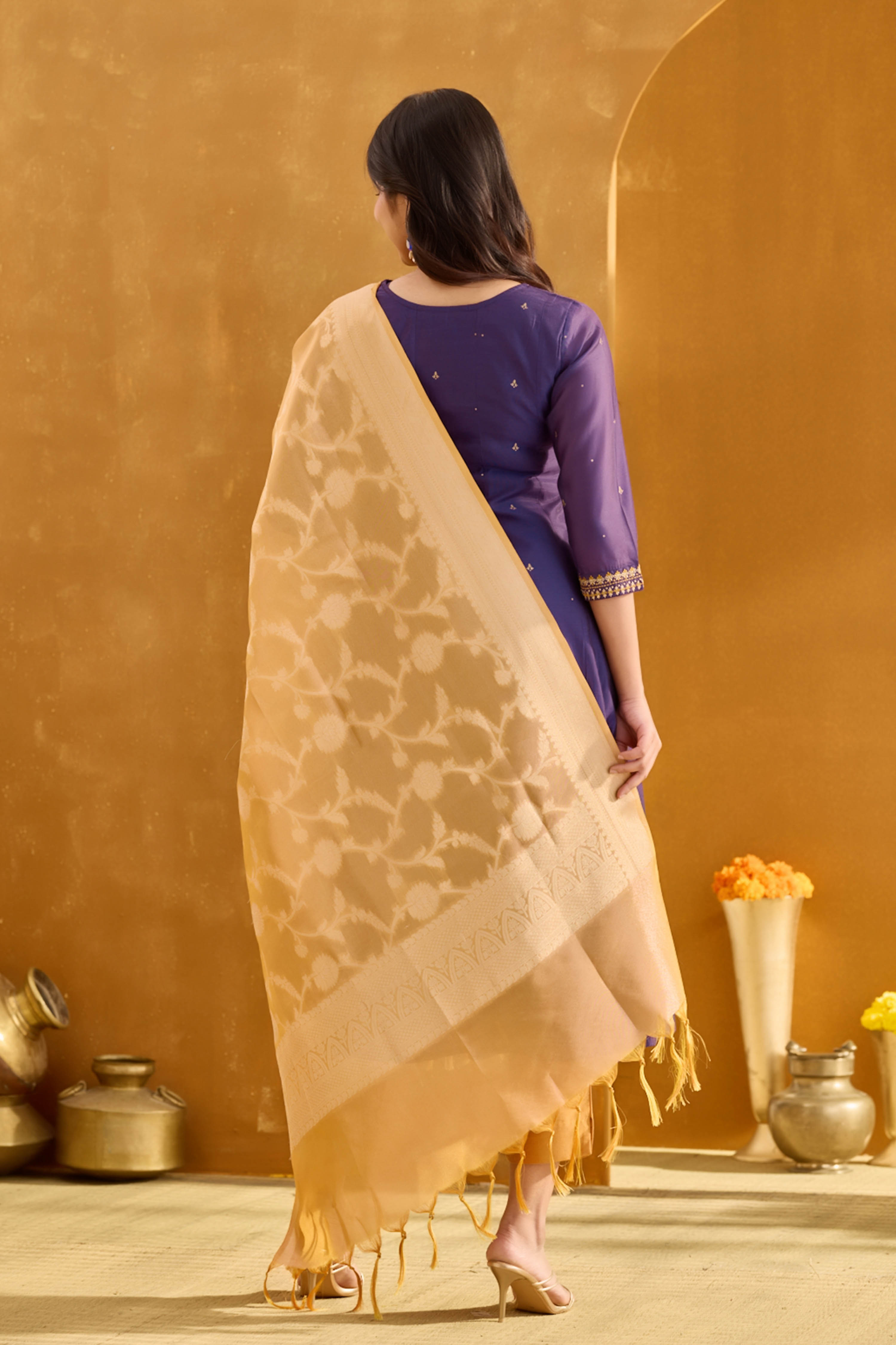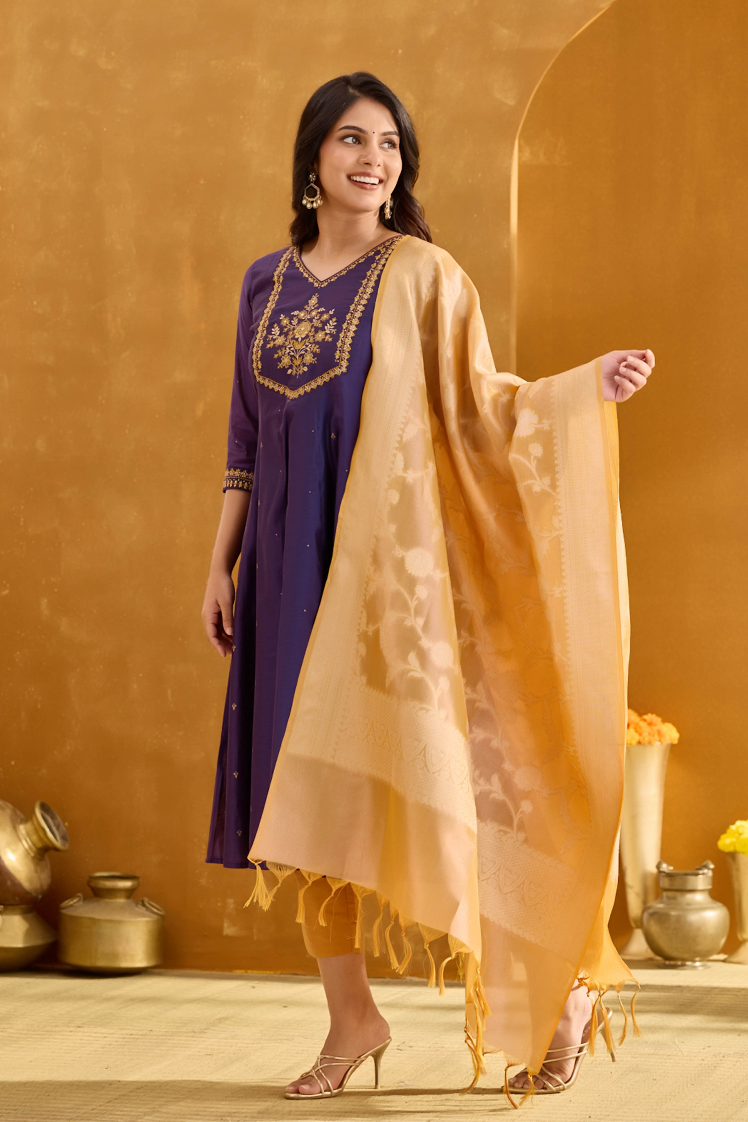 Elevate your festive style with this purple chanderi kurta set featuring golden embroidery & foil mirror work. Paired with mustard pants and a tissue dupatta, it’s perfect for weddings & Diwali celebrations.