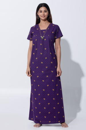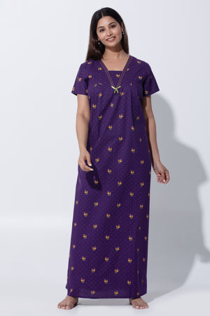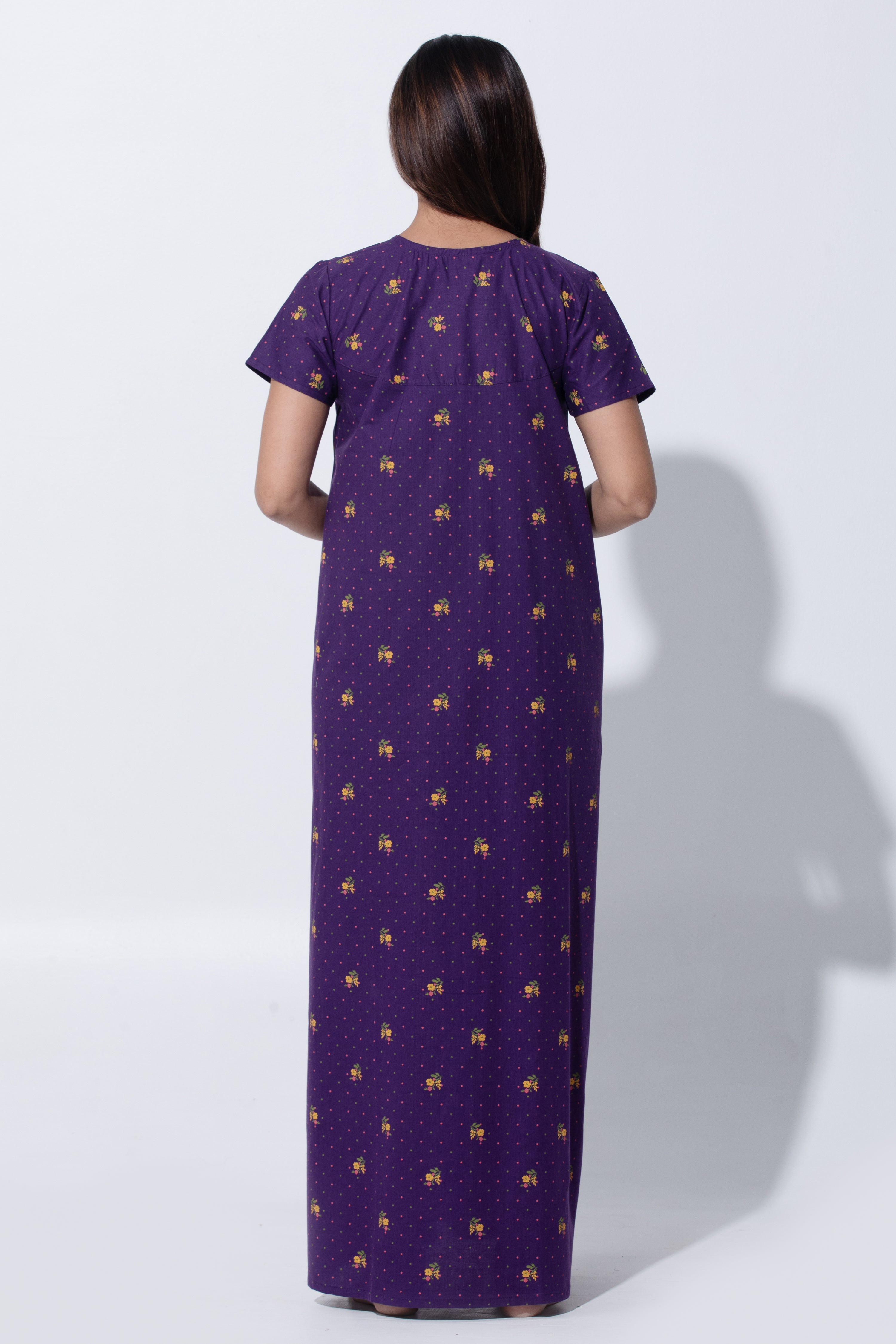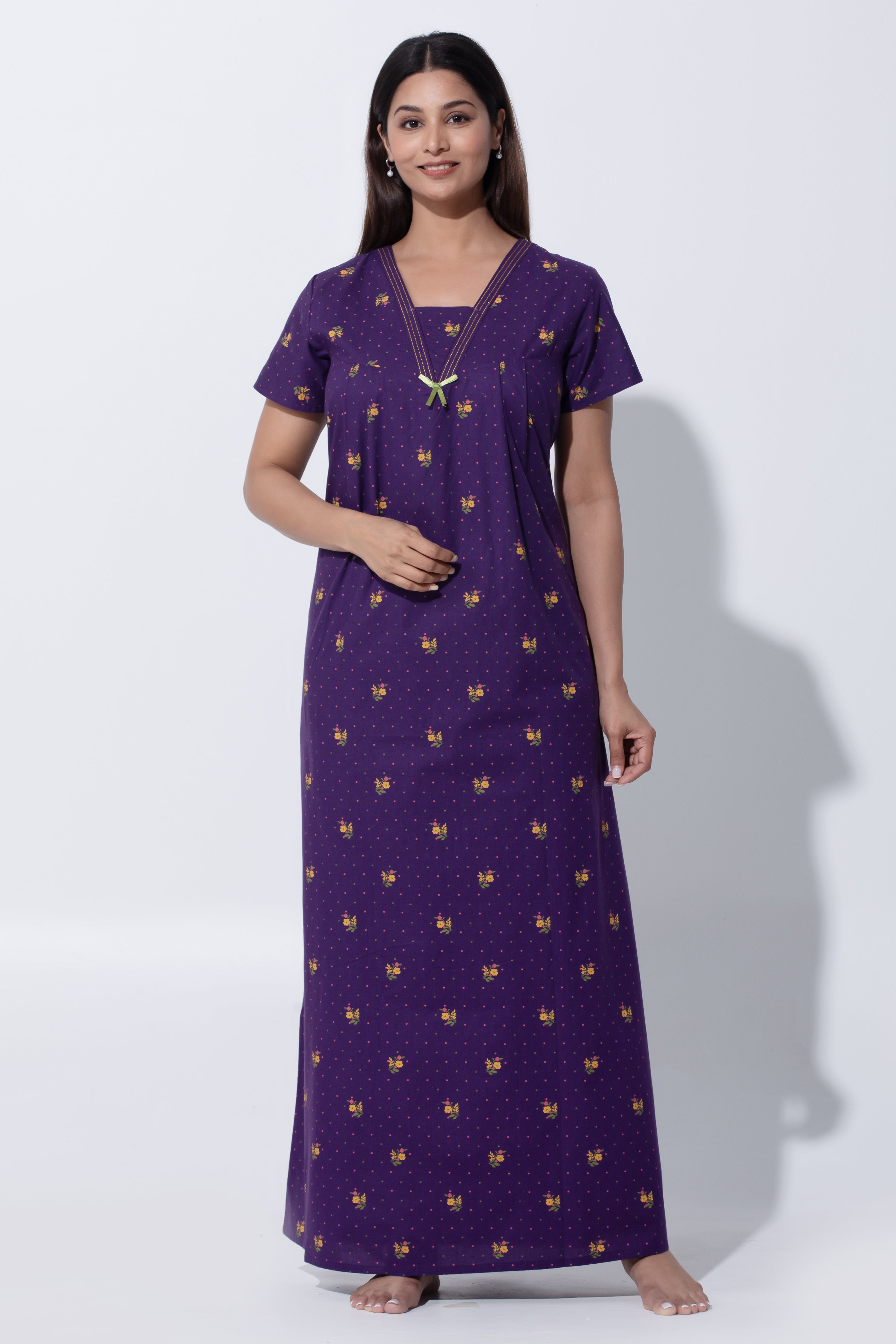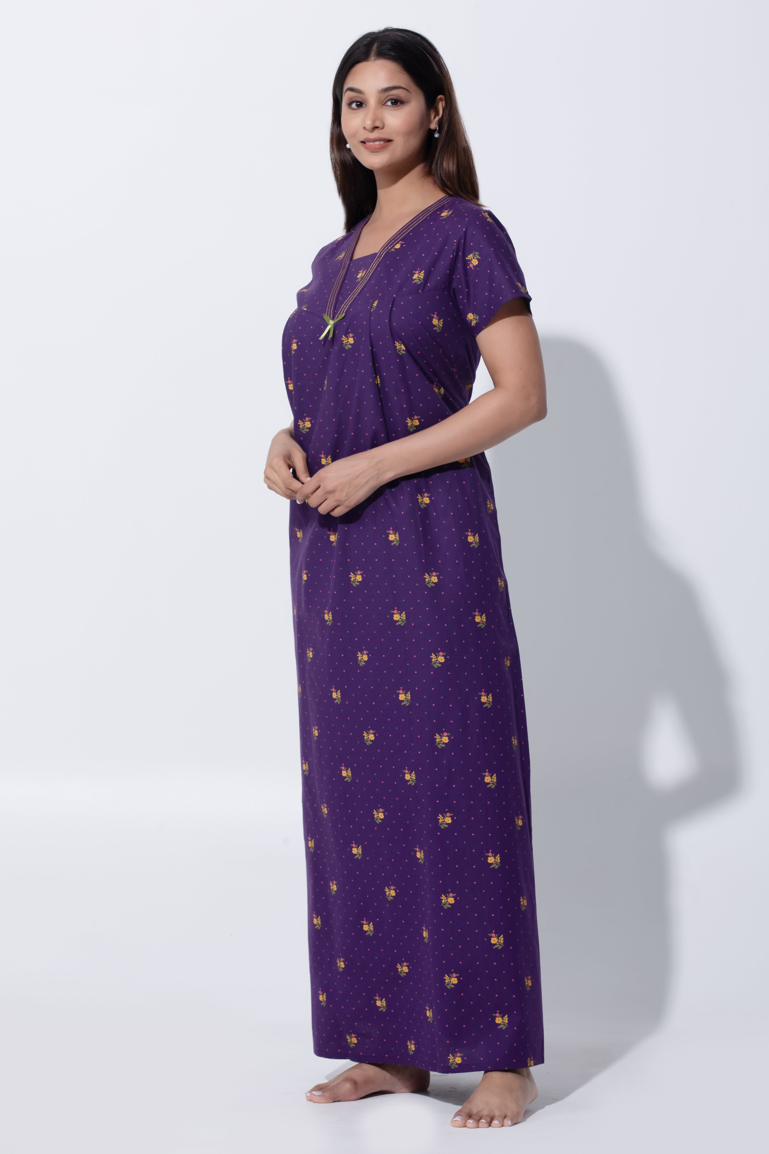 Purple Floral Printed Pure Cotton Nightwear with Running Stitch Neckline